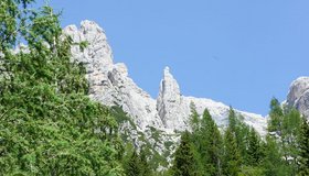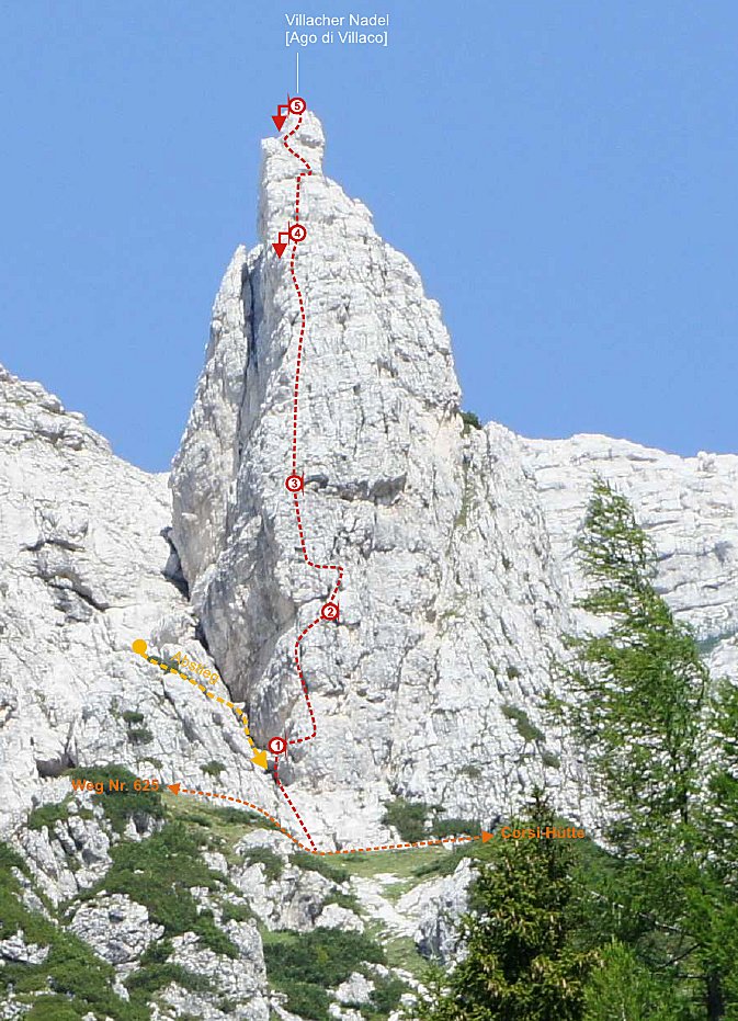 Über die Schotterstraße (Weg Nr. 628) hinauf zur „Grantagar- Alm“. Nun entweder über den direkten Weg unter der Seilbahn zur „Corsi-Hütte“ oder weiter entlang Weg Nr.628, der in Weg Nr. 625 übergeht. An der Kreuzung rechts weiter zur „Corsi-Hütte“. Von der „Corsi- Hütte“ (1874m) in südwestlicher Richtung in 10min auf markiertem Weg zum Fuße der Villacher Nadel, welche direkt über dem Weg aufragt (siehe Übersichtsfoto).