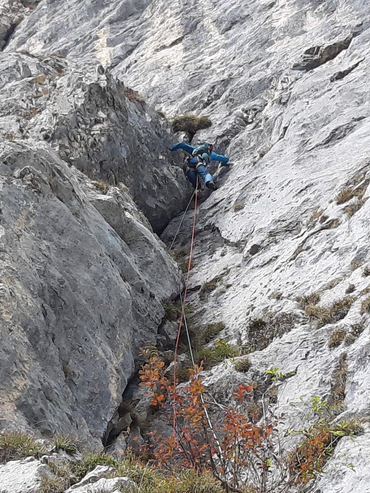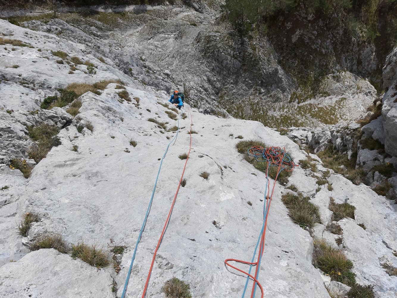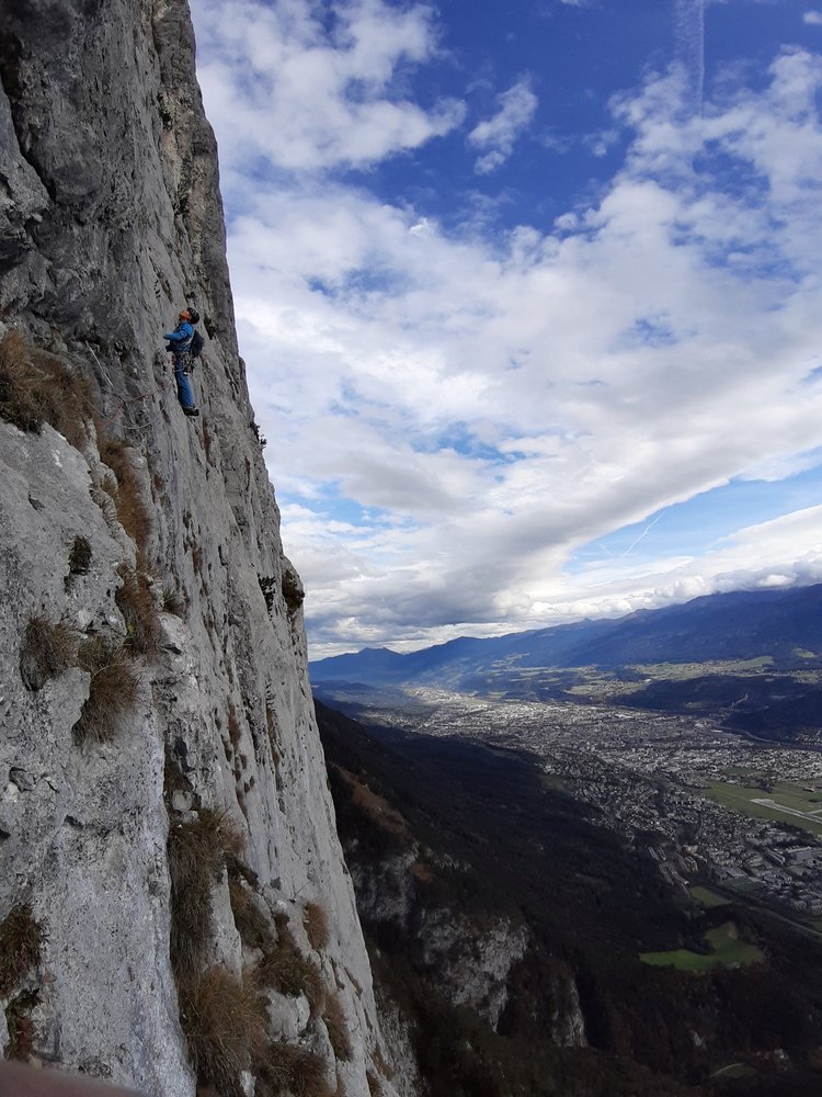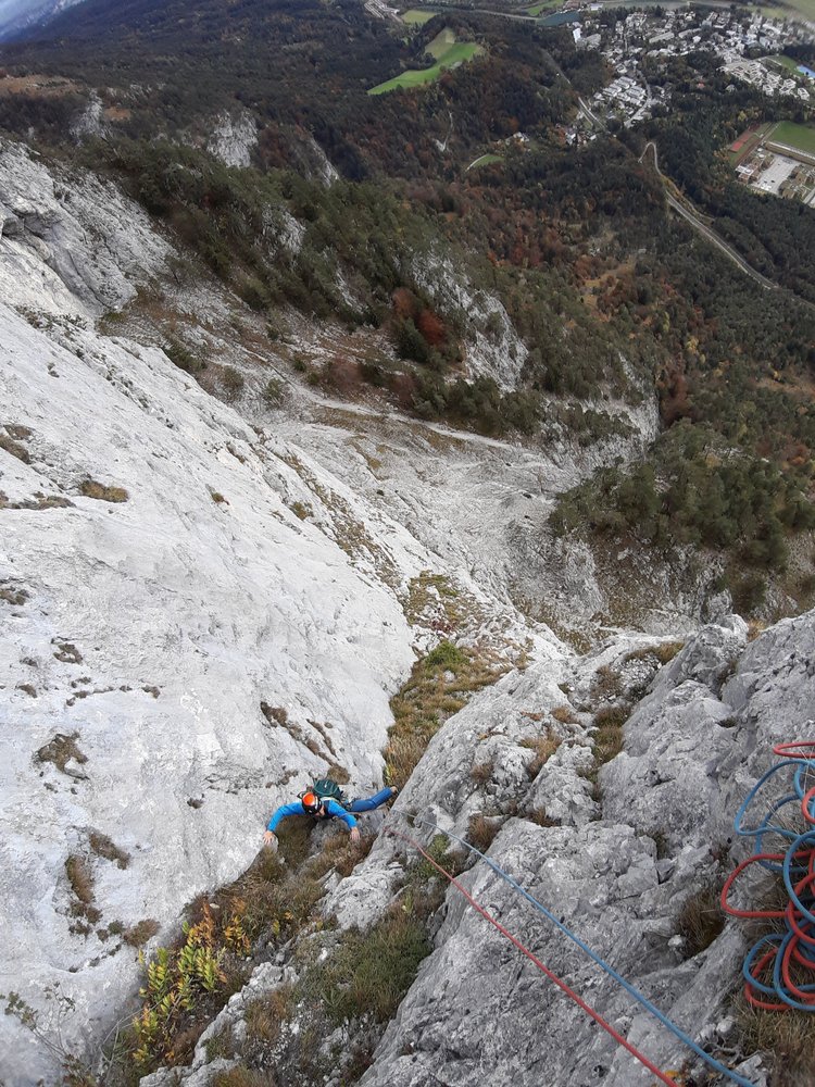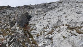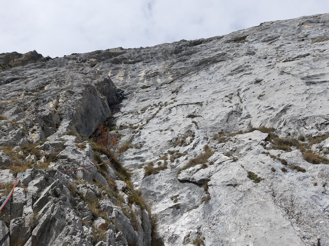 Unterer Teil der eigentlichen Tour - markante Verschneidung bis sichelförmigen Abschlussdachl - zuerst grasig, teils brüchig und spärlich abgesichert. nach oben hin wird die vegetation weniger und der fels besser. in der Schlüssellänge - Quergang unter dem Dachl nach rechts - stecken viele alten Rostgurken und kann mit BD3 gut ergänzt werden. Nächste SL weitere Rechtsquerung über Platte noch gut mit NH versichert. Im oberen Wandteil konnten keine weiteren Haken ausgemacht werden, aber Standplätze wurden bei Begehung genagelt und ein ZH belassen.