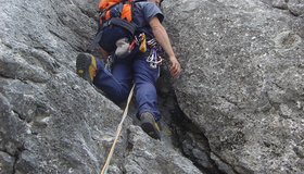 50 m-Halbseil (empfohlen), 6 Exp.-Schl., 2 SU-Schl., KK-Grundsortiment, Helm.
