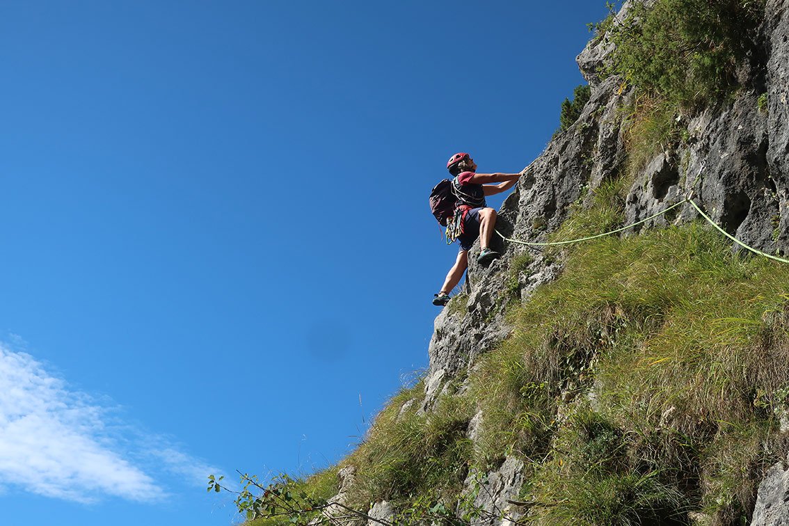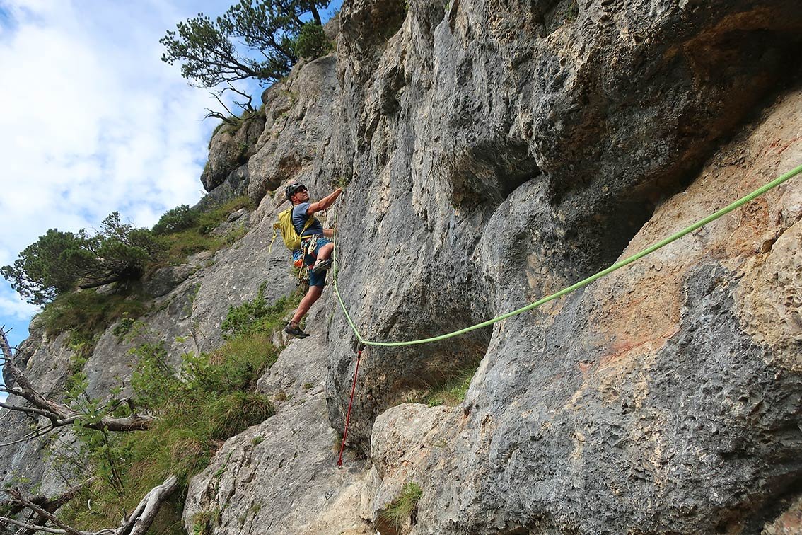 50 m Einfachseil, 14 Expressschlingen, Bandschlingen für Bäume und Latschen, Kletterausrüstung und Helm.