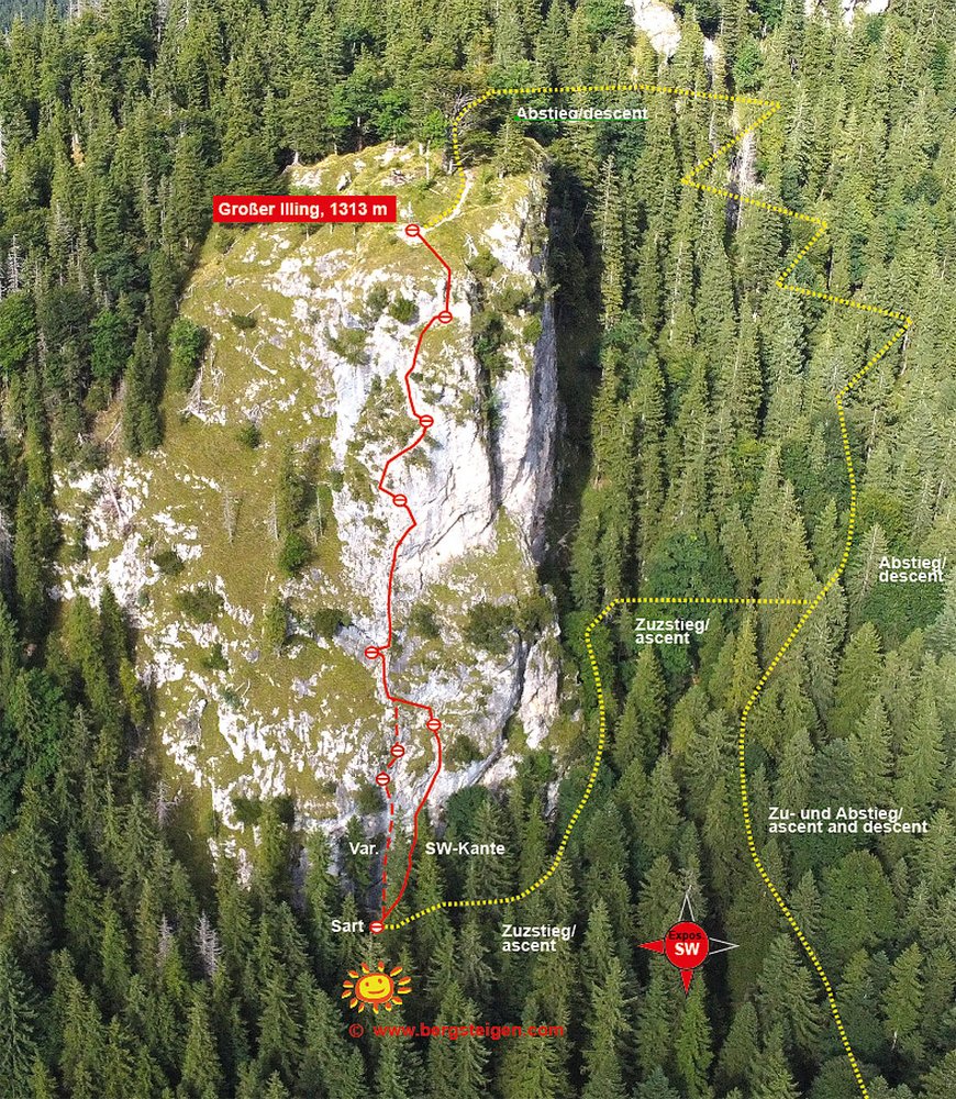 Die Südwestkante am Großen Illing ist eine für die Gegebenheiten ansprechende Mehrseillängentour oberhalb von Ohlstadt. Die Route wurde gut, in der oft etwas feuchten ersten Seillänge sogar sehr gut, mit Bohrhaken ausgestattet. Im Mittelteil gibt es eine sehr luftige, steile Seillänge. Die Route wird auch gerne von Einsteigern ins alpine Klettern besucht. Vom Gipfel des Großen Illing hat man einen schönen Blick in Richtung Murnau mit den Seen.