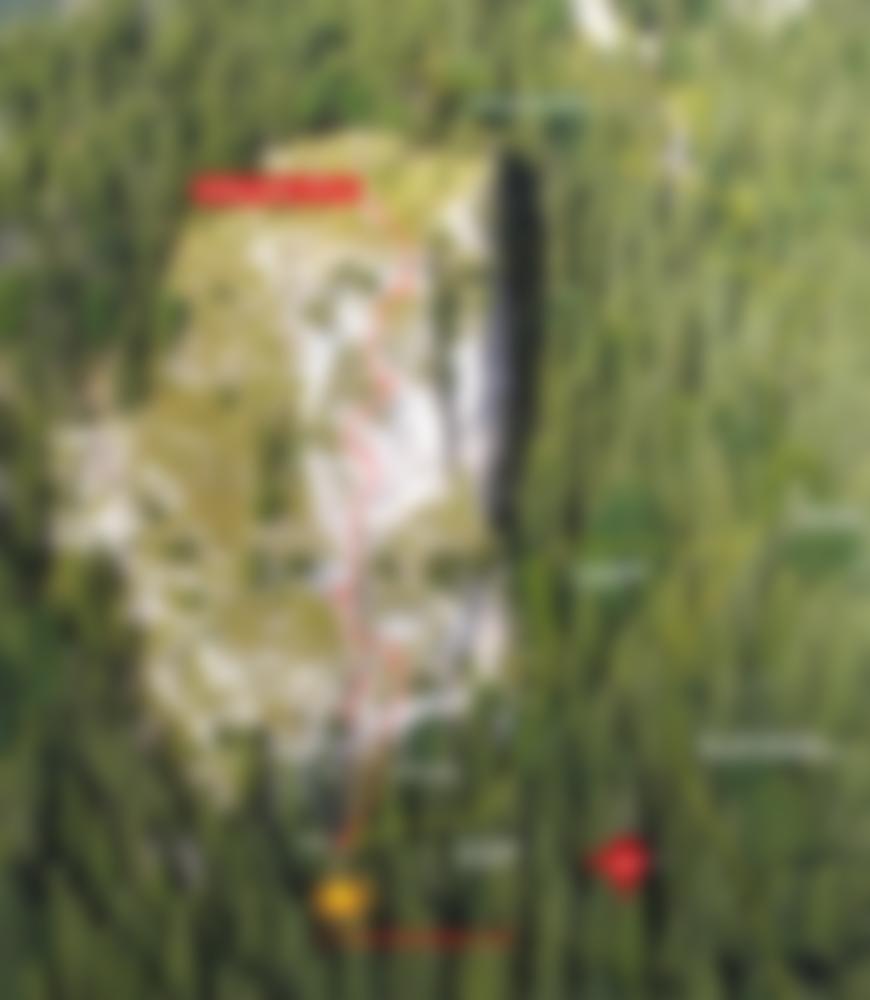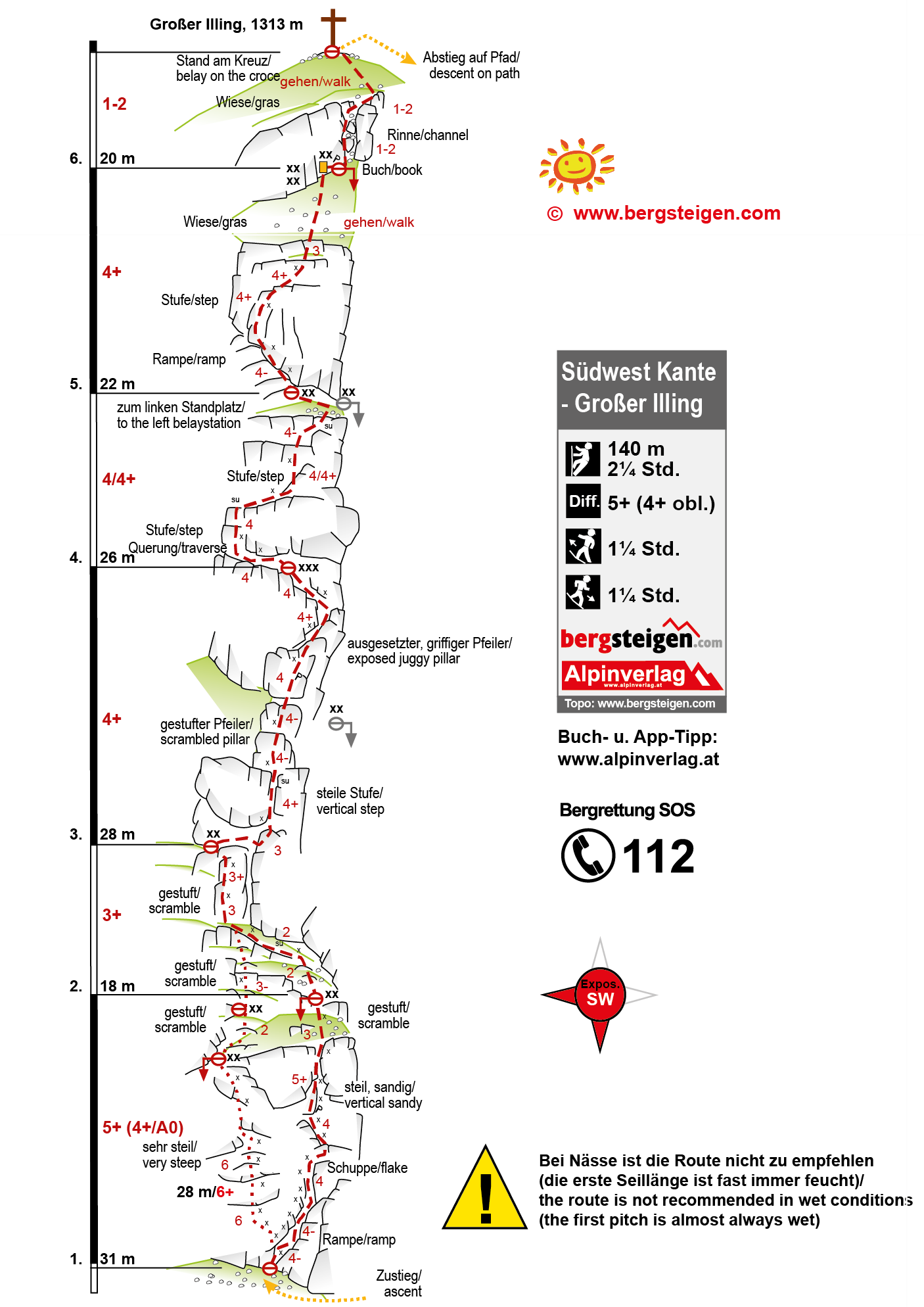 Siehe Topo. Beim Einstieg gibt es eine direkte 6+ Variante (an der Rampe gleich gerade hinauf), diese passt aber nicht ganz zum weiteren, einfachen Teil der Route.