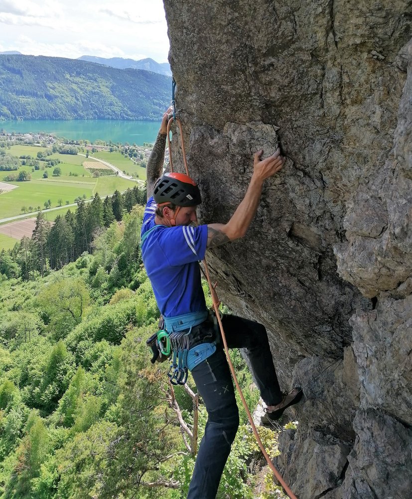 3 Sl 15m 7+/8- Zuerst ein recht einfacher Überhang, dann schwere Plattenkletterei. 9 zw. Haken