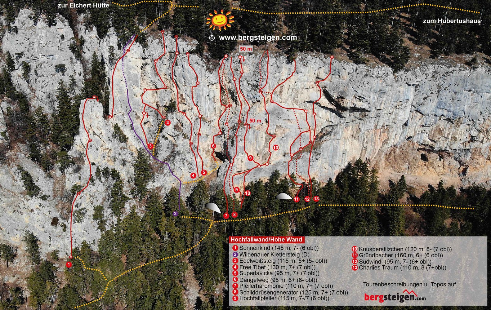 Von Oberhöflein entweder a) Über den Wagnersteig (gelb) bis zum Wandfußsteig (blau), nun rechts bis zu einer Abzweigung "Baumgartnerturm/Hochfallwand" (rot/blau später nur rot) bis zum Wandfuß mit Aufschrift "T+W" und noch 150 m weiter zur Höhle. b) Über den Springlessteig bis kurz vor die Eisenleiter, dort Abzweigung mit Tafel "Wildenauer und Turmsteig", unter den Hochfallwänden vorbei zur Höhle. c) In Zweiersdorf beim Gasthof Mohr parken (extra Wanderparkplatz...) und der Strasse Richtung Höflein (Richtung Schneeberg...) folgen. Die zweite Straße im Ort rechts hinein (Markierungen an Laternen und im Wald beachten....) und Richtung Hubertushaus. Man kommt auf den Springlessteig. Nun weiter wie b).