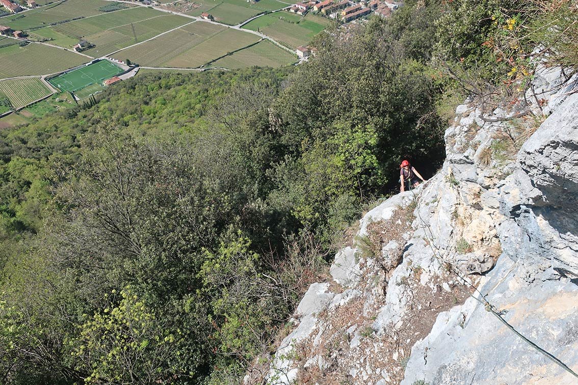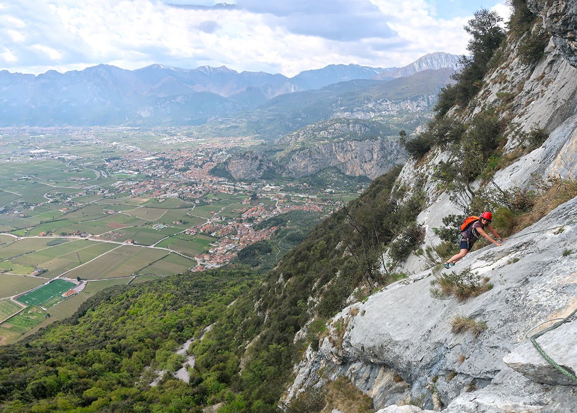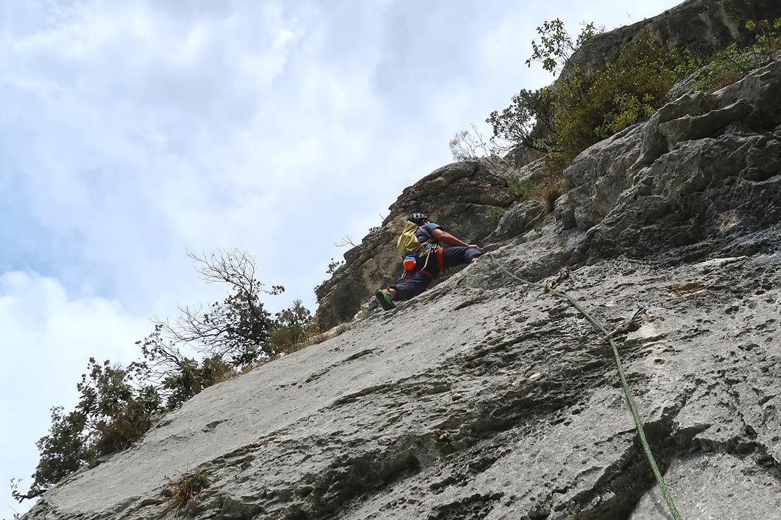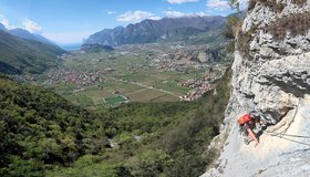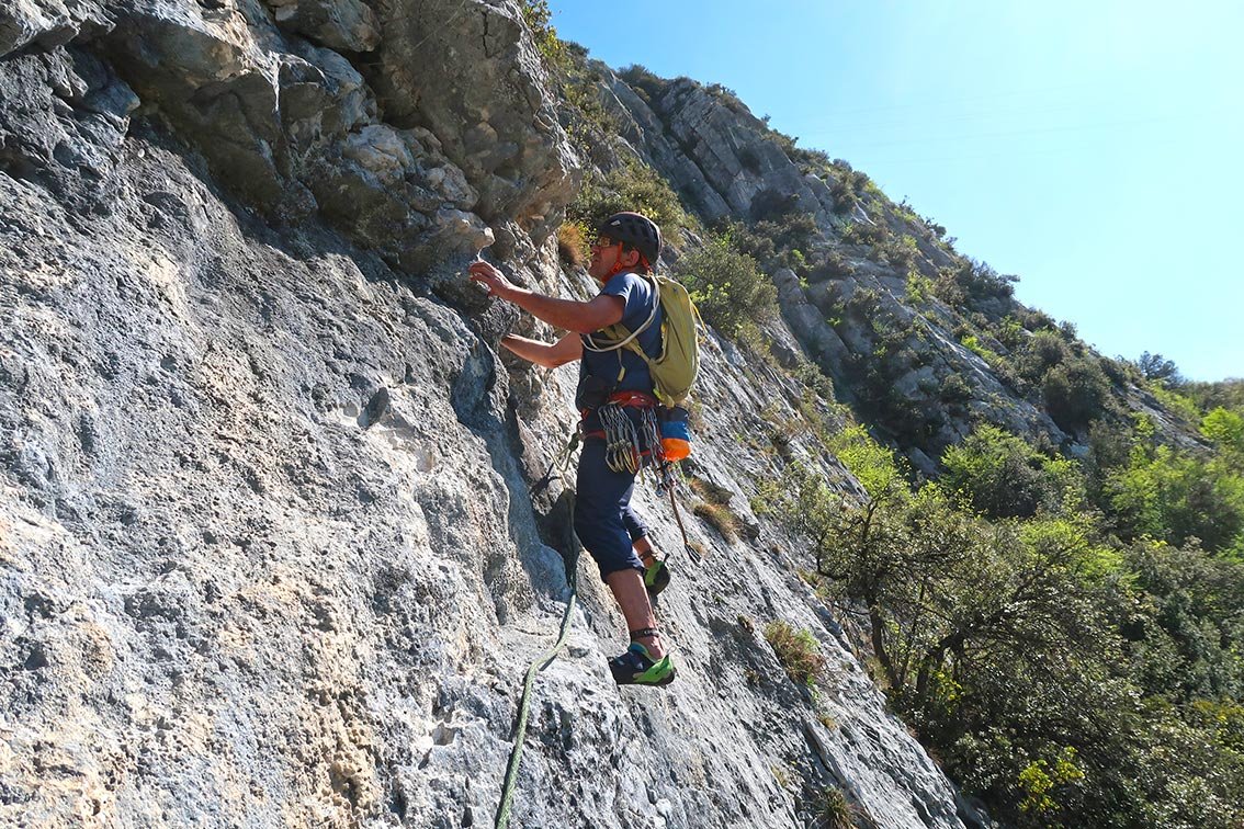 Die Sulle Pance del Pezol ist wegen der vielen Quergänge eine der längsten Anstiege an der Parete di Pezol. Geschickt haben sich die Erstbegeher die schönsten Felspassagen herausgesucht und diese mit teilweise langen, aber nicht sehr anspruchsvollen Querungen verbunden. Die zwei schweren Passagen sind sehr gut abgesichert und können auch gut mit Hakenhilfe überwunden werden. Einzig kleiner Schönheitsfehler sind die recht üppig gebohrten Griffe an den beiden Schlüsselstellen - Ethikapostel schreien laut auf, andere sind erfreut über die mit der Bohrmaschine geschaffene 7er-Stellen. Wie auch bei den anderen Pezol und Ir Touren ist das landschaftliche Flair und der tolle Gardaseeblick bei der Sulle Pance del Pezol natürlich auch inkludiert.