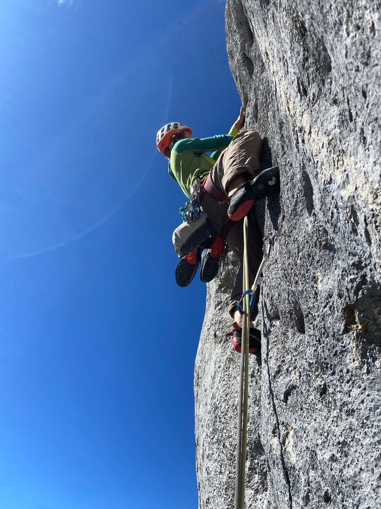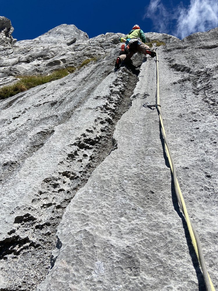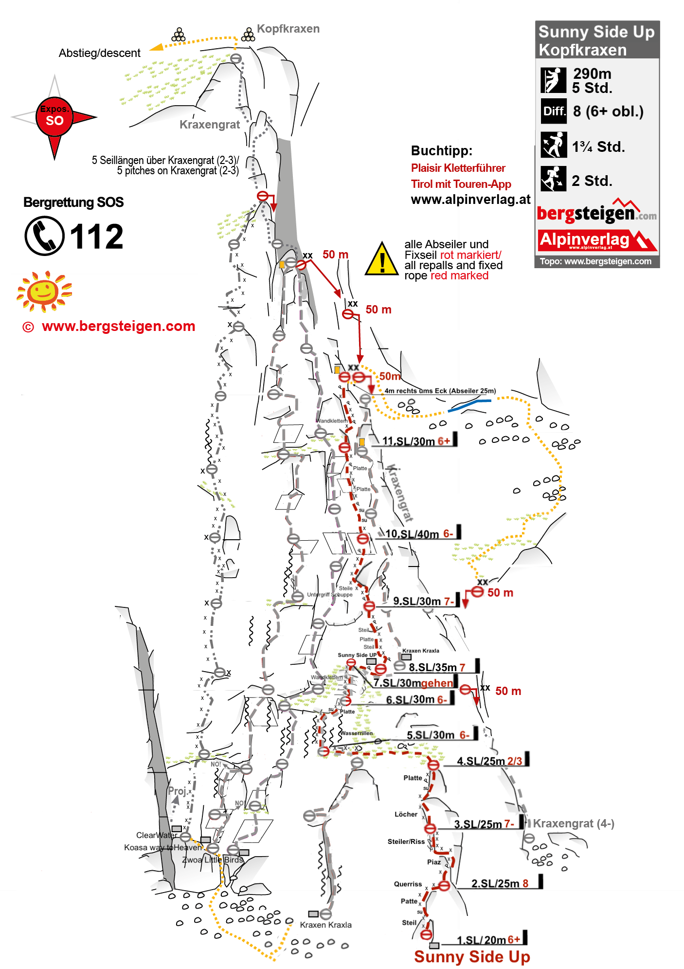 Bitte über den neuen Abstieg absteigen. Wegen Steinschlag Gefahr beim Seil abziehen! Der Abstieg ist Rot markiert. Es sind alle Abseilstände eingerichtet. Man sieht den Weg gut vom letzten Stand aus. Wenn man leicht rechts Richtung Sonneck schaut, dann sieht man die Roten Punkte! Siehe Topo!