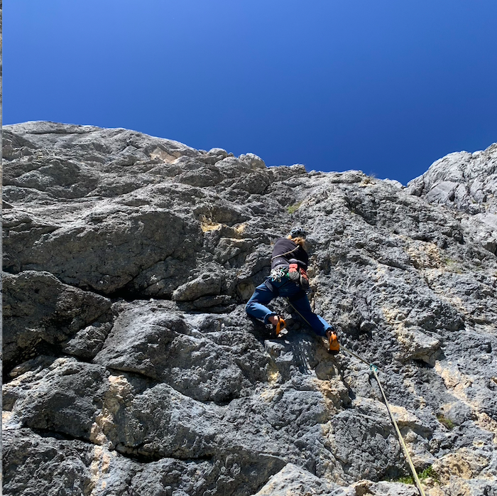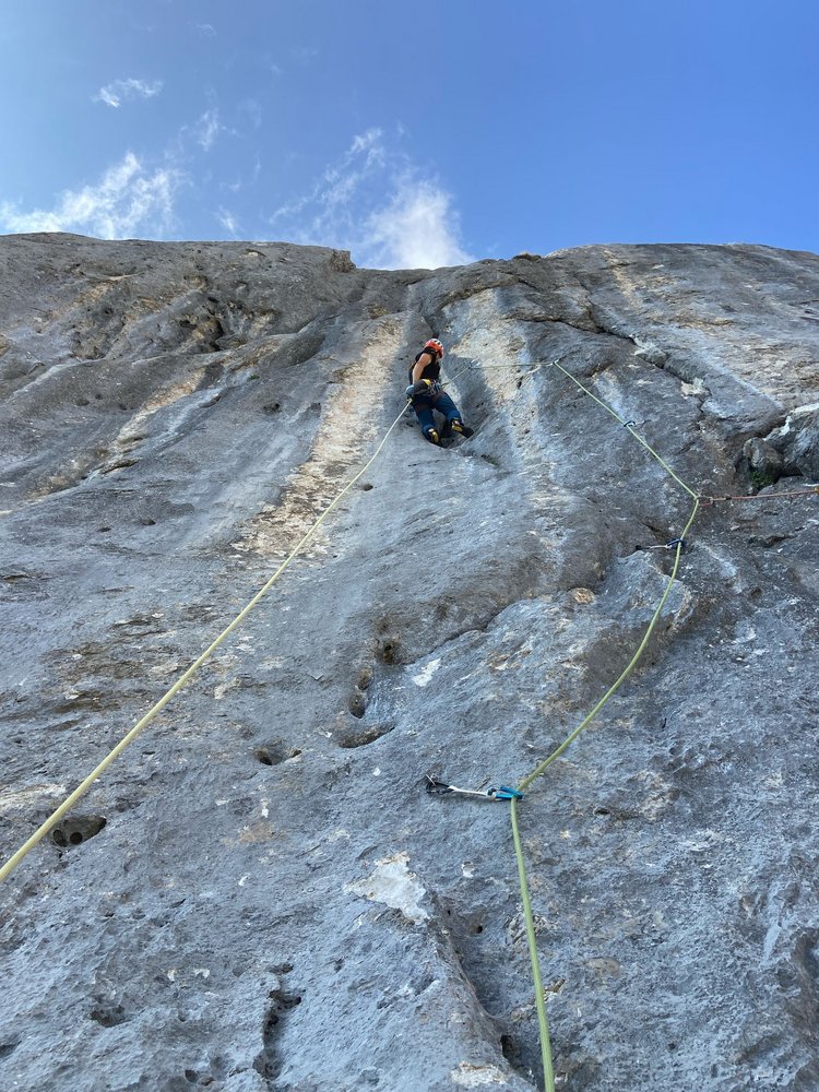 A: Für Variante A ist ein eingerichteter Weg mit Abseiler (Rot markiert)! Beim letzen Stand muss man in eine Scharte auf der Hinterseite Abseilen (25m Meter). Weiter zu einer Fix Kette. Die Kette folgen und dann das Band weiter Richtung Sonneck Südwand gehen. (Rote Punkte). Da dann ein Bachbett/ Schotterrinne nach unten zum Abseilstand folgen ( Rot Punkte). Da dann in die Scharte abseilen 2x 50 m. Der Ausgangspunkt ist dann der Einstieg vom Kraxengrat!