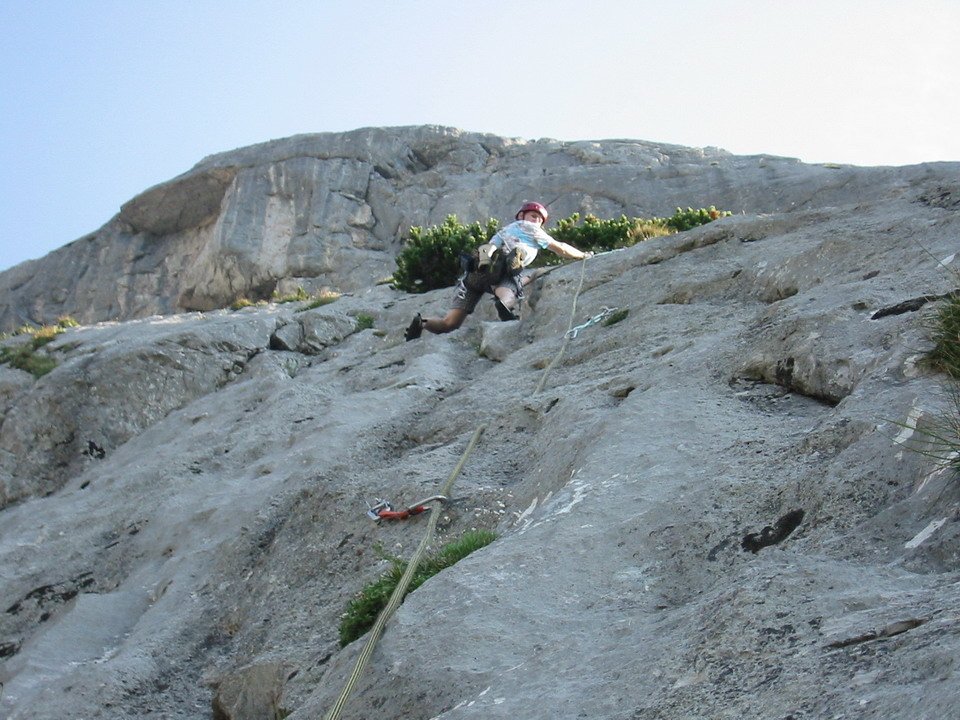 Vom Gipfel links ueber grosses Wiesenkar wieder unschwierig zum Einstieg (Rucksackdepo) zurück.