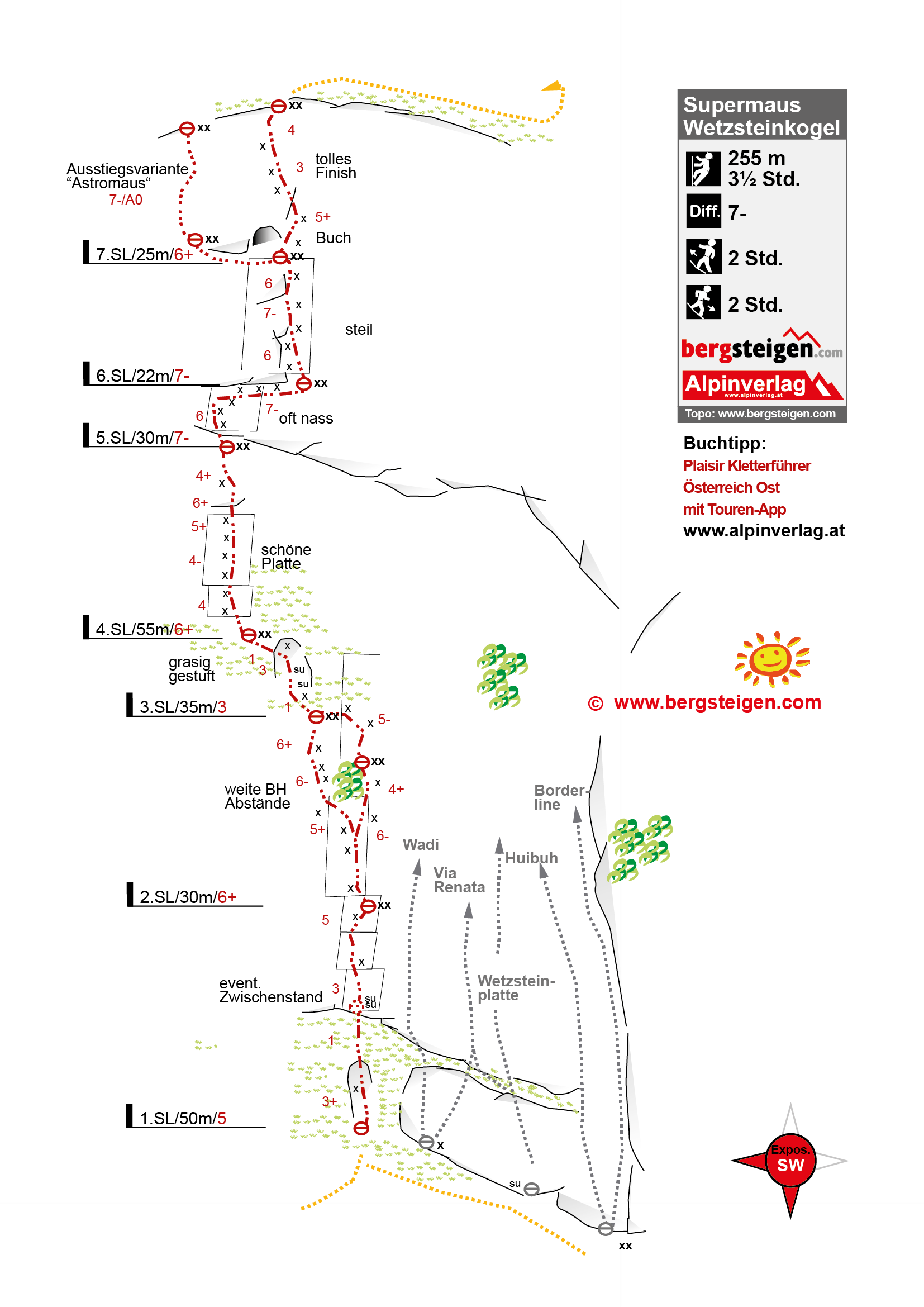 Interessante und abwechslungsreiche Tour auf der Wetzsteinplatte. Im unteren Bereich sehr schöne Plattenkletterei, unterbrochen von von einer Schrofenpassage. Im oberen Teil steile Wandkletterei in kompakten, rauhen Fels mit einem ausgesetzten Quergang. Die Supermaus stellt eine weitere sehr schöne Alternative zur klassischen und oft überlaufenen Wetzsteinplatte dar. Ganz oben gibt es noch links die Ausstiegsvariante "Astromaus" 7-/A0.