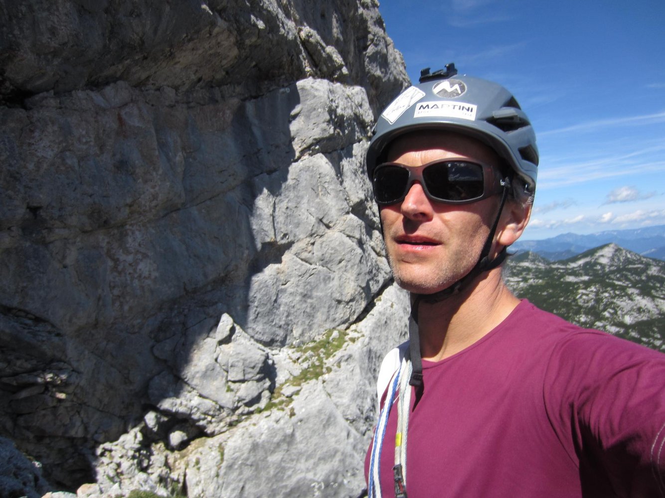 Die Tour endet auf dem Pfeilerkopf, von dem man entweder über die links gelegene Ostwand-Route abseilen oder unschwierig auf den Gipfel steigen kann.