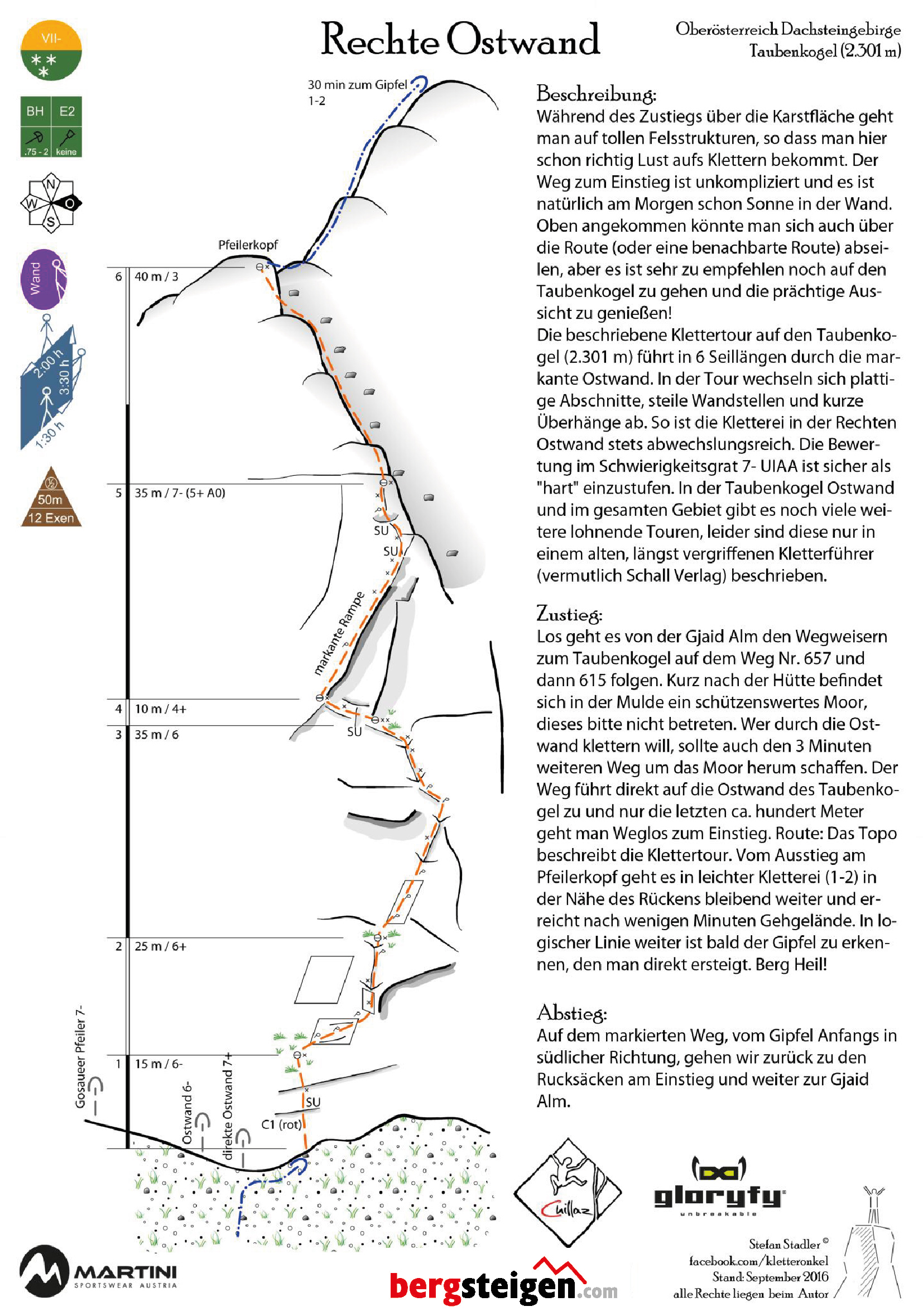 Abwechslungsreiche Kletterei in der Ostwand des Taubenkogels. Es wechseln Platten, Wandstellen und Überhänge in durchaus gutem Fels.