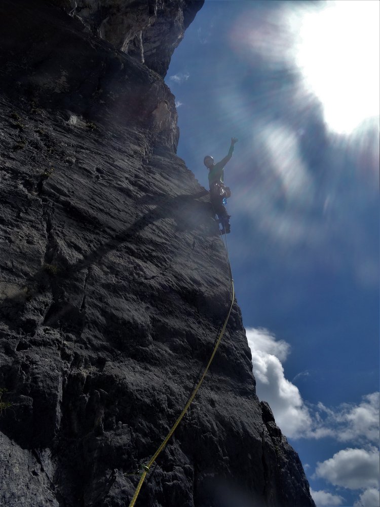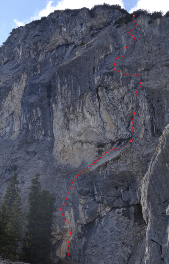 Alpine Sportkletterei, die nicht allzu üppig mit Bohrhaken gesichert ist, ohne dabei wirklich gefährlich zu werden. Die wenigen Möglichkeiten für mobile Sicherungsmittel wurden genutzt und im Topo vermerkt. Es überwiegt sehr guter, vom Wasser zerfressener Fels, aber auch kurze etwas und eine sehr brüchige Passage wollen sicher geklettert werden und unterstreichen den deutlich ernsteren Charakter im Vergleich zur benachbarten „Sonne hinter dem Nebel“. Die Route wurde ohne vorheriges Erkunden von unten erstbegangen und eingebohrt, die obligatorische Schwierigkeit liegt bei 8+ in der zweiten Seillänge.