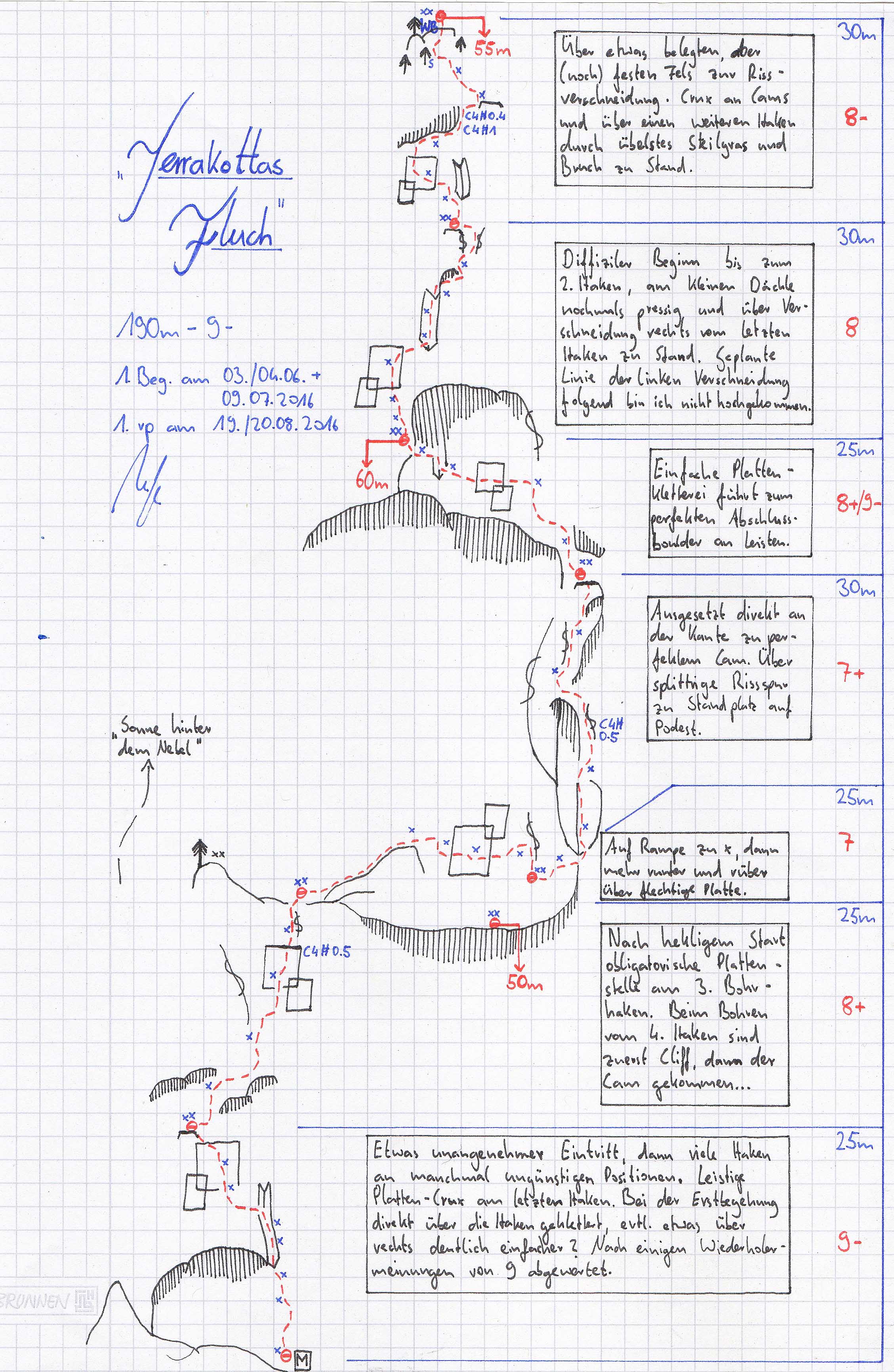 Passend zur Chinesischen Mauer, den hohen Schwierigkeiten und der vermeintlichen Uneinnehmbarkeit wählten wir den Namen der riesigen, unschlagbar wirkenden Terrakotta-Armee des ersten Kaisers von China Qin Shi Huang Di, in Kombination mit einem offensichtlichen Fluch vor und während der Erstbegehung: Ein kaputter Bohrer, kaputte Akkus, zu wenige Bohrhaken auf Lager, eine klatschnasse Wand mit der damals einzigen trockenen Linie, mehrere 10-Meter-Flüge mit der Bohrmaschine in der einen, dem Cliff oder einem Griff in der anderen Hand und ein kaputtes Auto waren nicht die idealen Vorrausetzungen.