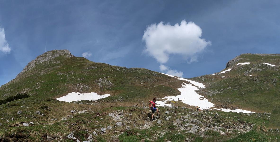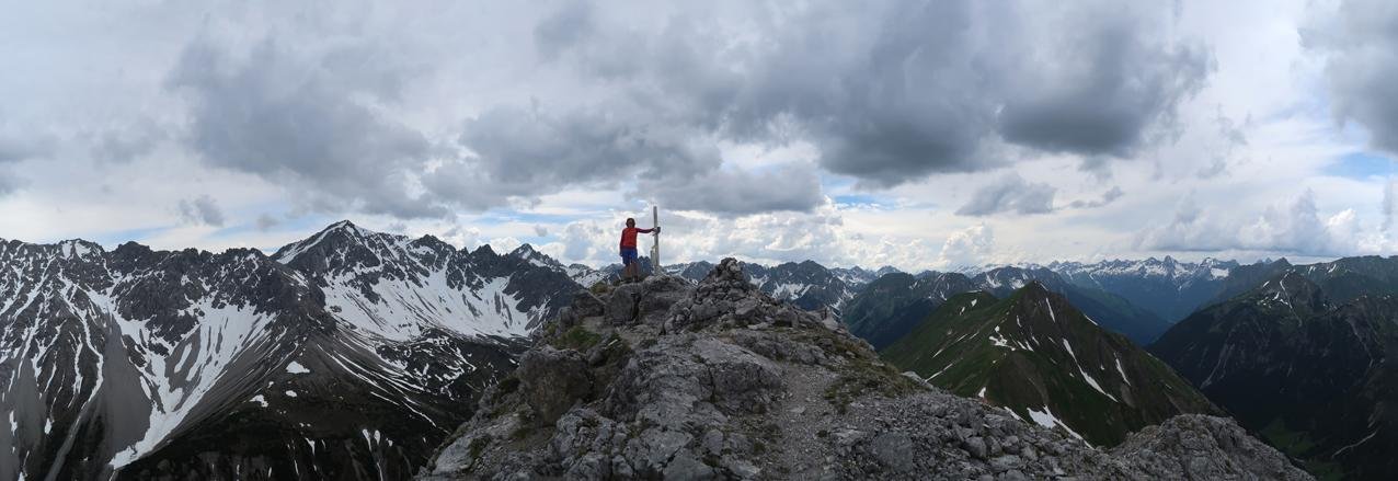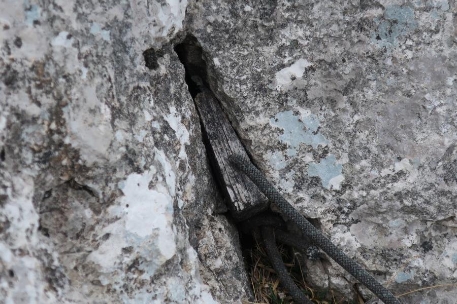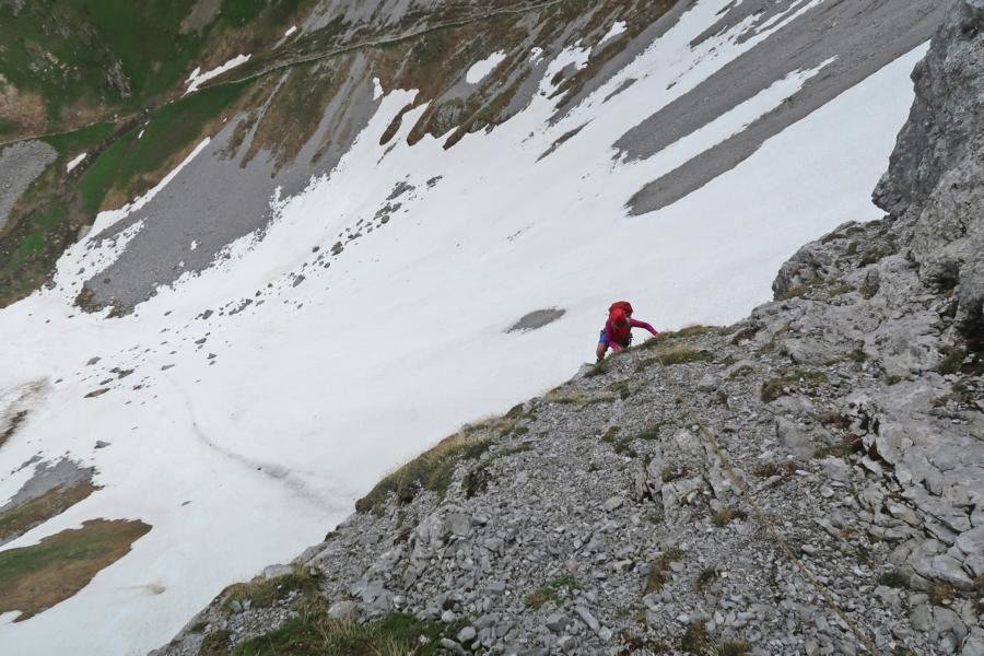 Vom Grasband bzw. der Schrofenrinne (dort endet im Grunde die Tour) nach rechts um die Ecke. Nach der Ecke links im Schutt hinauf und oben den Steinmännchen folgend über leichte Schrofen (Stellen 1) hinauf zum Wanderweg. Von dort kann man nach rechts in ein paar Schritten hinauf zum Gipfel steigen.