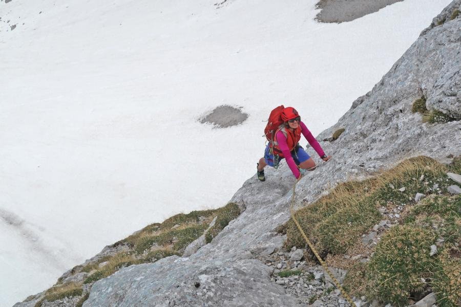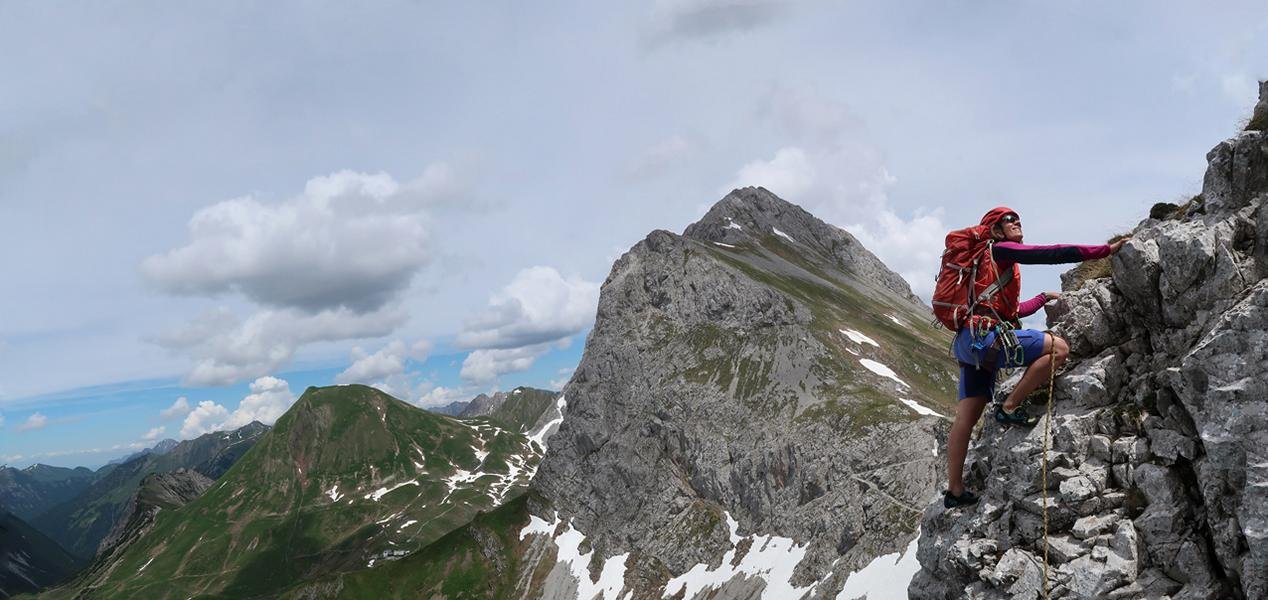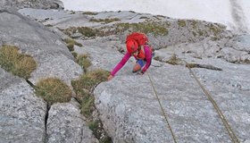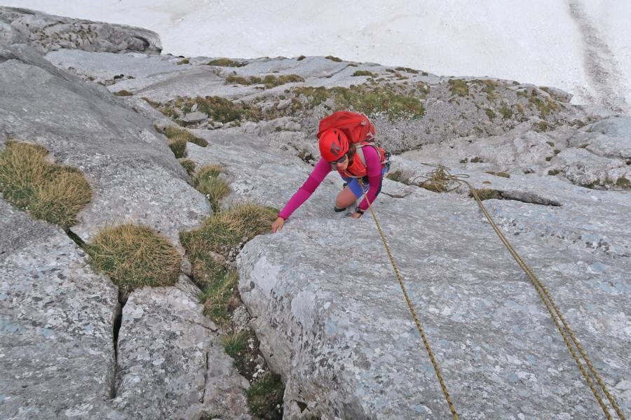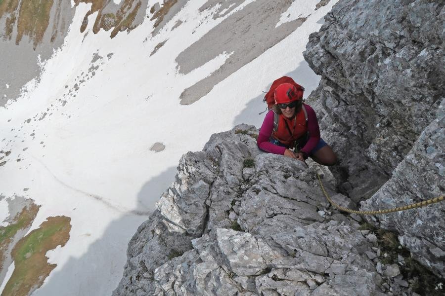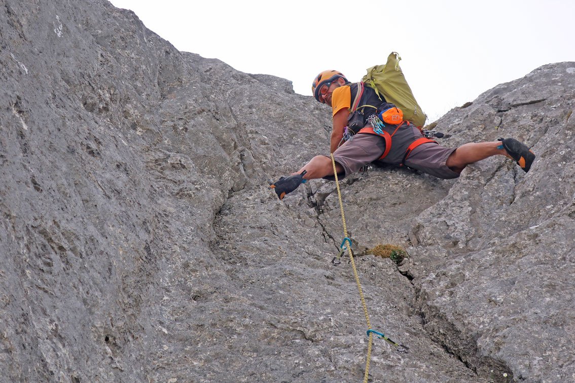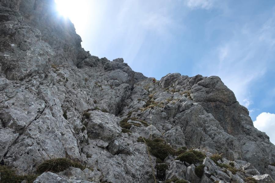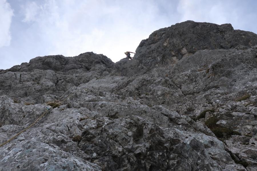 Die Tour hat zwar Bohrhaken, der 5te Grad sollte aber vom Vorsteiger beherrscht werden (dann tut sich dieser im tlw. nicht ganz festen 3er und 4er Gelände auch viel leichter…).
