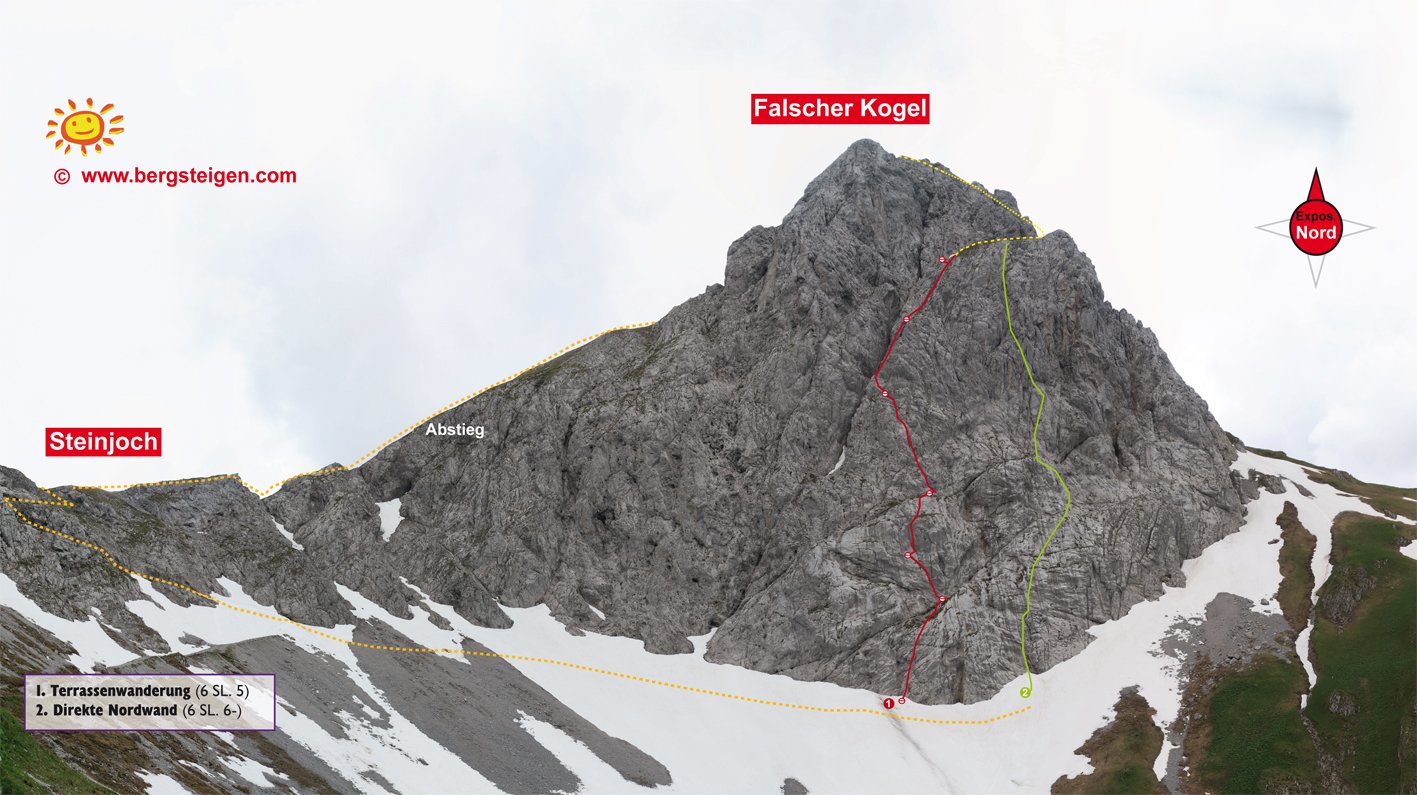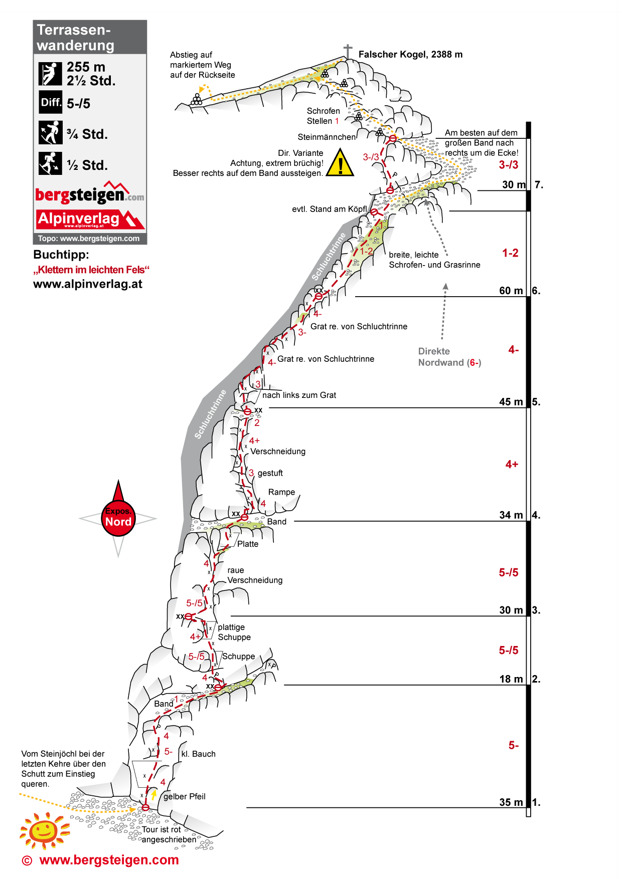 Schöne, semialpine Route in toller Umgebung. Hat man das Hahntennjoch mit seinem Motorradlärm hinter sich gelassen, taucht man beim Steinjöchl in einen perfekten Mix aus grünen Wiesenhängen und schroffen Felswänden ein und mittendrin ist die putzige Nordwand des Falschen Kogels. Der Anstieg geht von Band (Terrasse) zu Band und verläuft meist durch guten Fels. Die nicht üppige, aber doch solide Bohrhakenabsicherung tut ihr übriges und so ist dieser Anstieg doch recht bliebt. Fazit: Man findet gut durch die Nordwand hinauf, Zu- und Abstieg sind kurz und die Landschaft ist top!