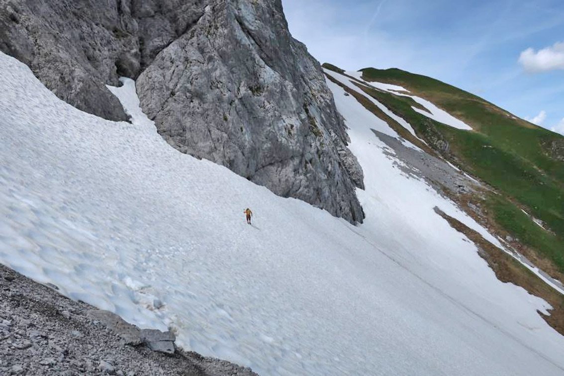 Siehe Topo: Im Grunde immer rechts der großen Rinne hinauf auf das Grasband.