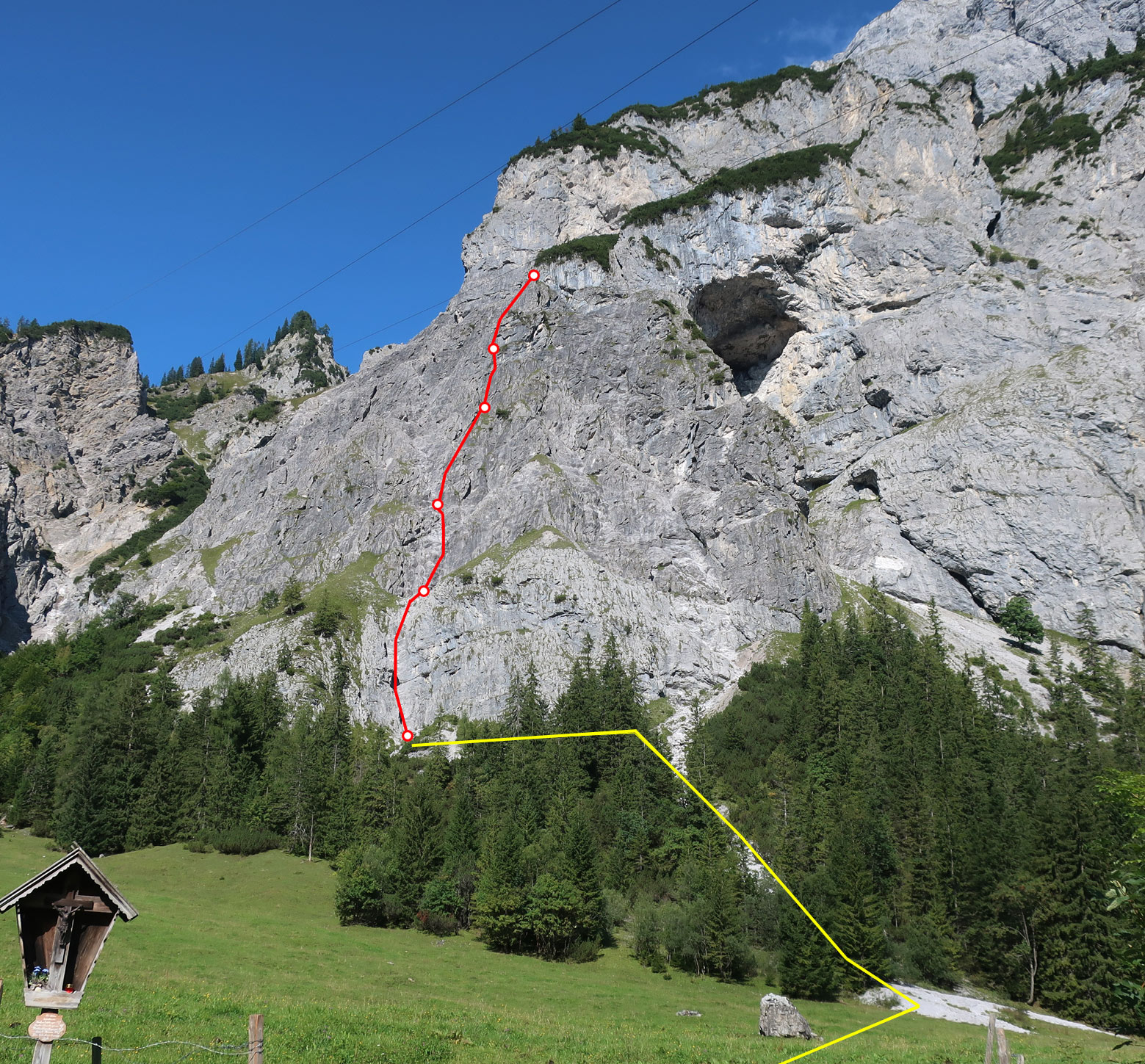 Die Tour ist vor allem an den leichten Passagen brüchig, auf den Flachstücken liegt viel loses Gestein. Wenn schon eine Seilschaft in der Route klettert, sucht man sich besser ein anderes (brüchiges) Ziel an der Wand. Info-Tafel mit den Routen hängt bei der Gramaialm.