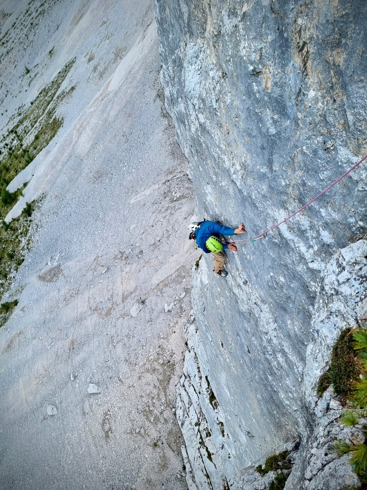 SL 5: Nochmal lässiger Fels. Am dritten Hacken nicht zu weit Links. Im oberen Teil nicht zu hoch an die Kante - in der Wand gibt's besseren Fels.