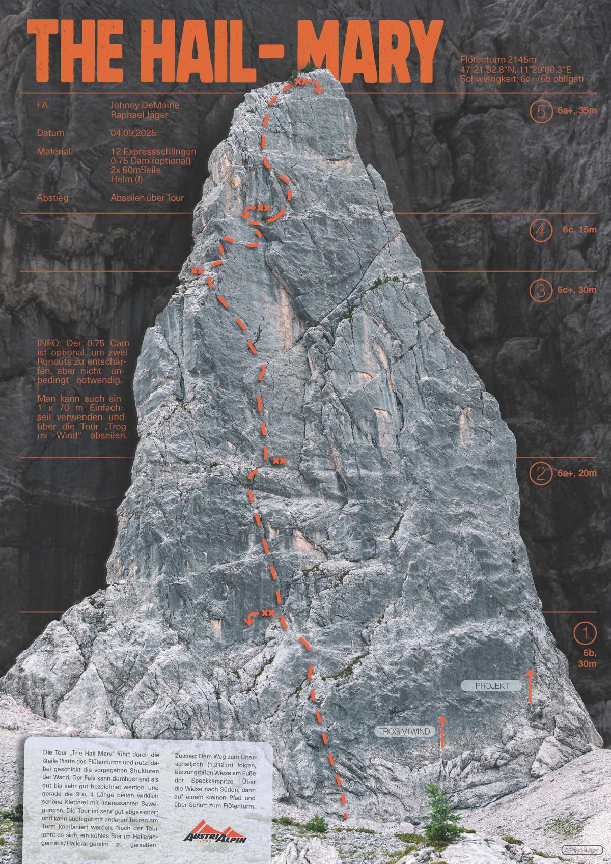 Die Tour „The Hail Mary“ führt durch die steile Platte des Flötenturms und nutzt dabei geschickt die vorgegebenen Strukturen der Wand. Der Fels kann durchgehend als gut bis sehr gut bezeichnet werden und gerade die 3 und 4 Länge bieten wirklich schöne Kletterei mit interessanten Bewegungen. Die Tour ist gut abgesichert und kann auch gut mit anderen Touren am Turm kombiniert werden.