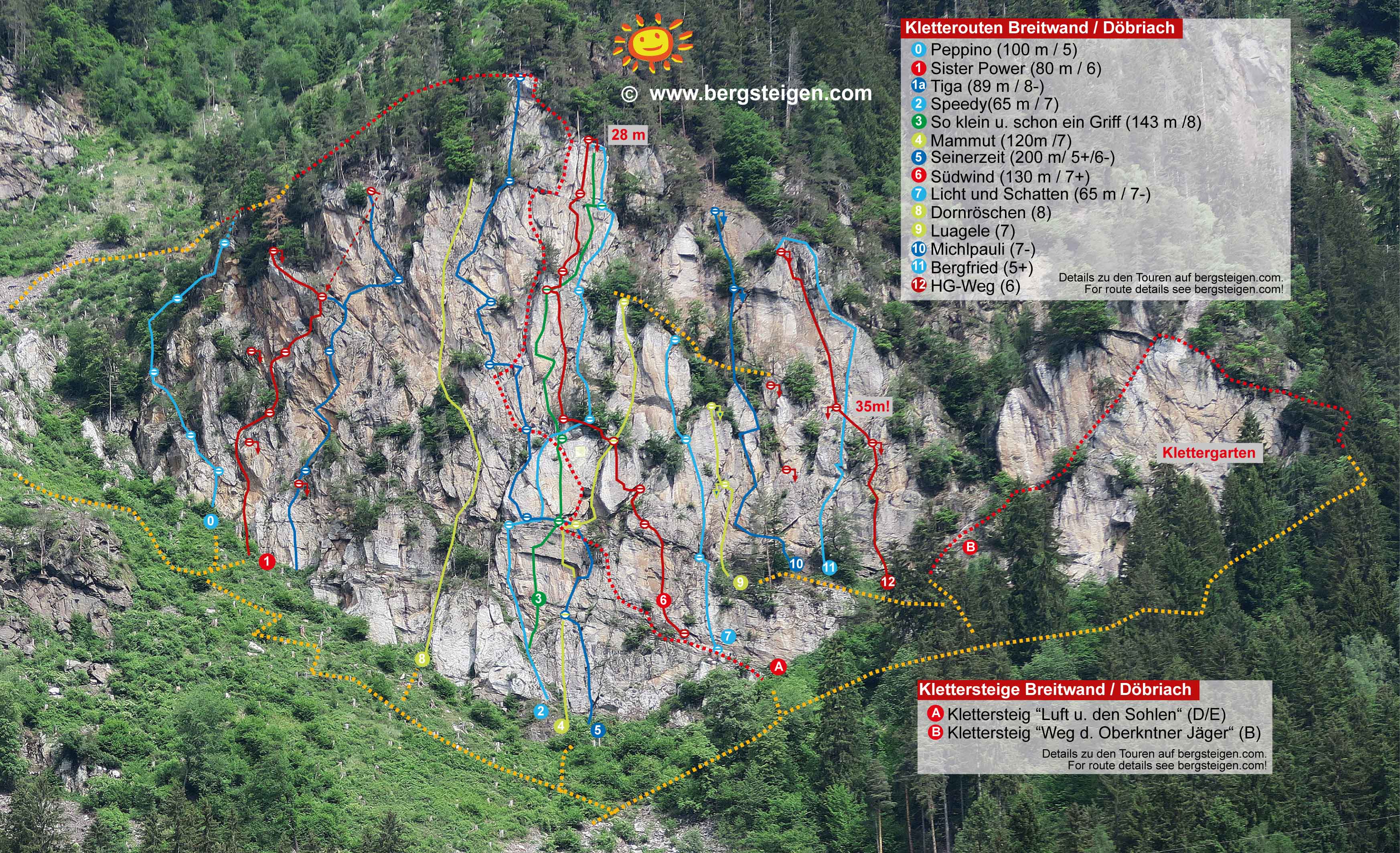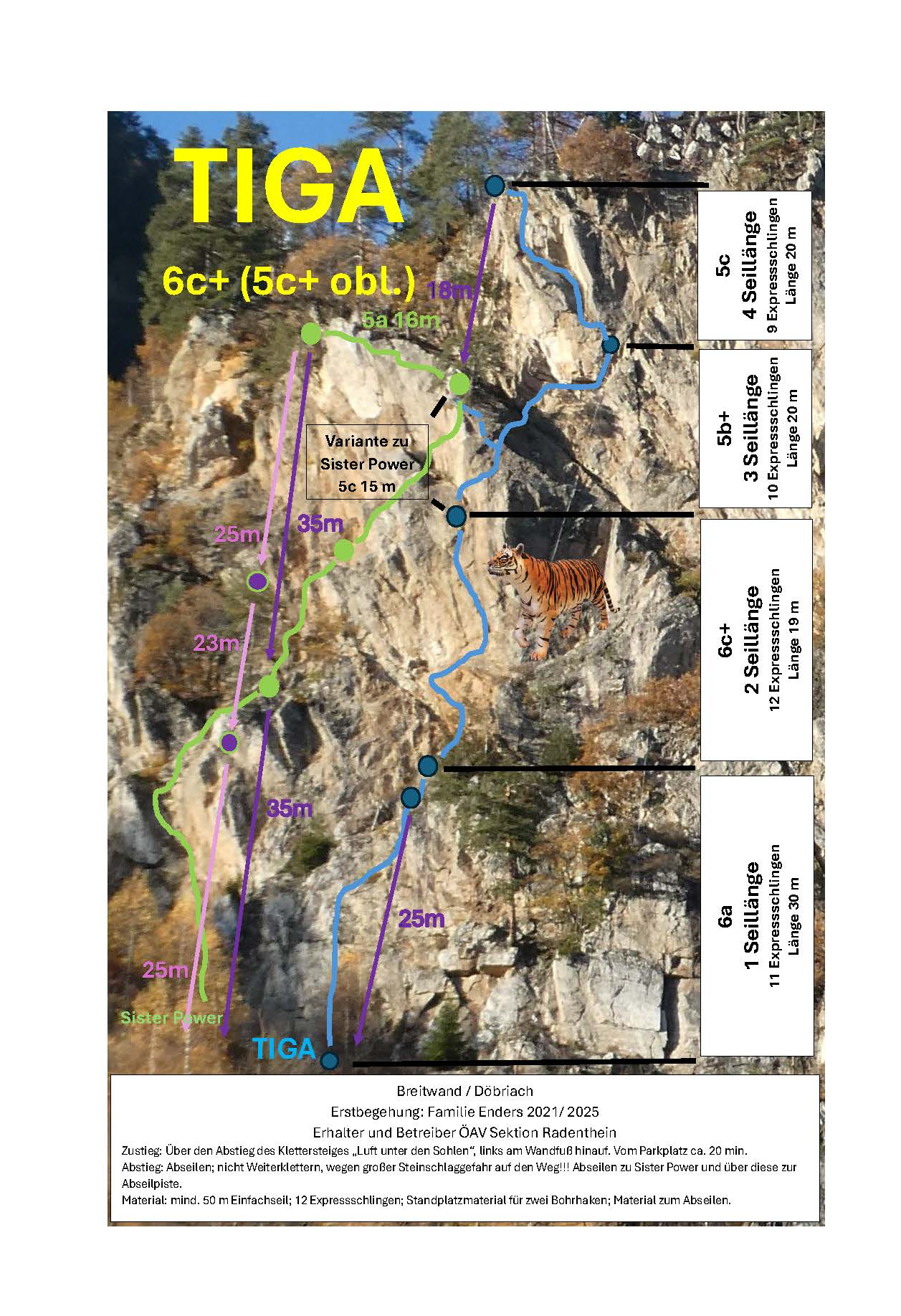 Nicht nach der letzten Seillänge austeigen um Steinschlag auf den Weg unter der Wand zu vermeiden. Sondern Abseilen zu Sister Power und über diese weiter. Siehe Topo.