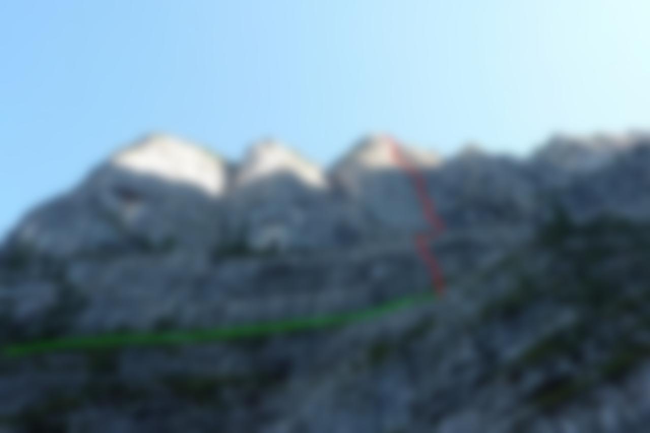 Nach ein paar Metern quert man eine markante Rinne. Nach weitern ca. 100m führen Steigspuren den Wald links steil rauf (rote Markierungen). Diese für weitere ca. 20-30min verfolgen, bis der Weg nach links unter das Übeleck mit seinen 3 Pfeilern. Am besten, man steigt links vom mit Felsbändern zurchzogenen Wandvorbau die steile Grasrampe rauf, bis man zum kurzen Fixseil (siehe Topo) kommt. Über den kurzen Felsaufschwung rauf und das Grasband nach rechts bis zum Einstieg queren. Der erste Standplatz befindet sich nach dem kurzen Felsband (5m - ca. UIAA 3-4) - siehe Topo.