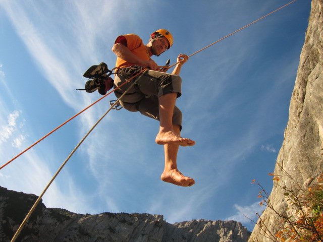 Vom Ende der Tour über die Route abseilen. Man seilt teilweise recht luftige 3 x 50 Meter und 1 x 20 Meter ab (siehe Übersichtsbild). Dann auf dem schon bekannten Zustiegsweg zurück zum Parkplatz beim Jägerwirt.