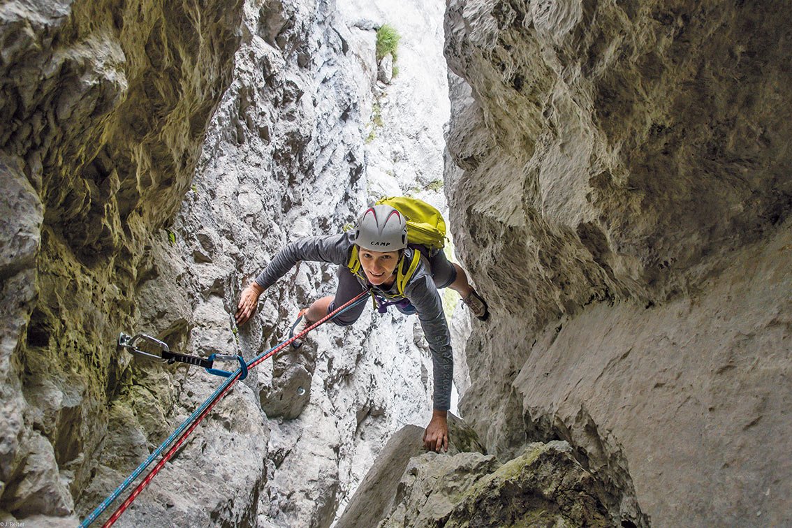 In dieser außergewöhnlichen, fast originellen Route klettert man ca. 50 Meter im Berg. Obwohl Kamin-Klettern eine heikle Angelegenheit ist, wird es dank der guten Bohrhakenabsicherung in diesem langen Kamin fast zum Klettergenuss. Die äußerst luftige Abseilfahrt am Ende der Tour rundet diesen perfekten Abenteuer-Klettertag ab.