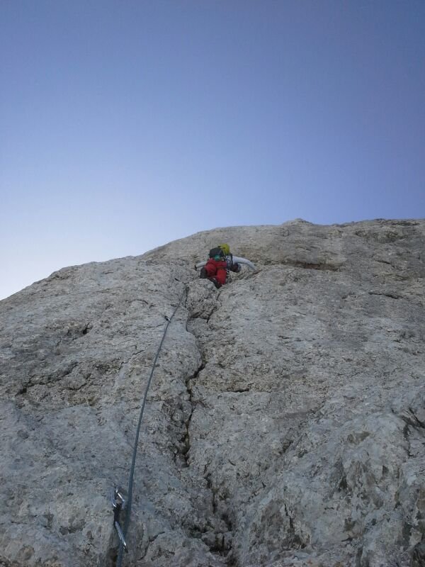 Wenn nach einem weitere Seillschaften in die Wand einsteigen, ist im oberen Wandteil extrem auf das Vermeiden von Steinschlag zu achten!!!