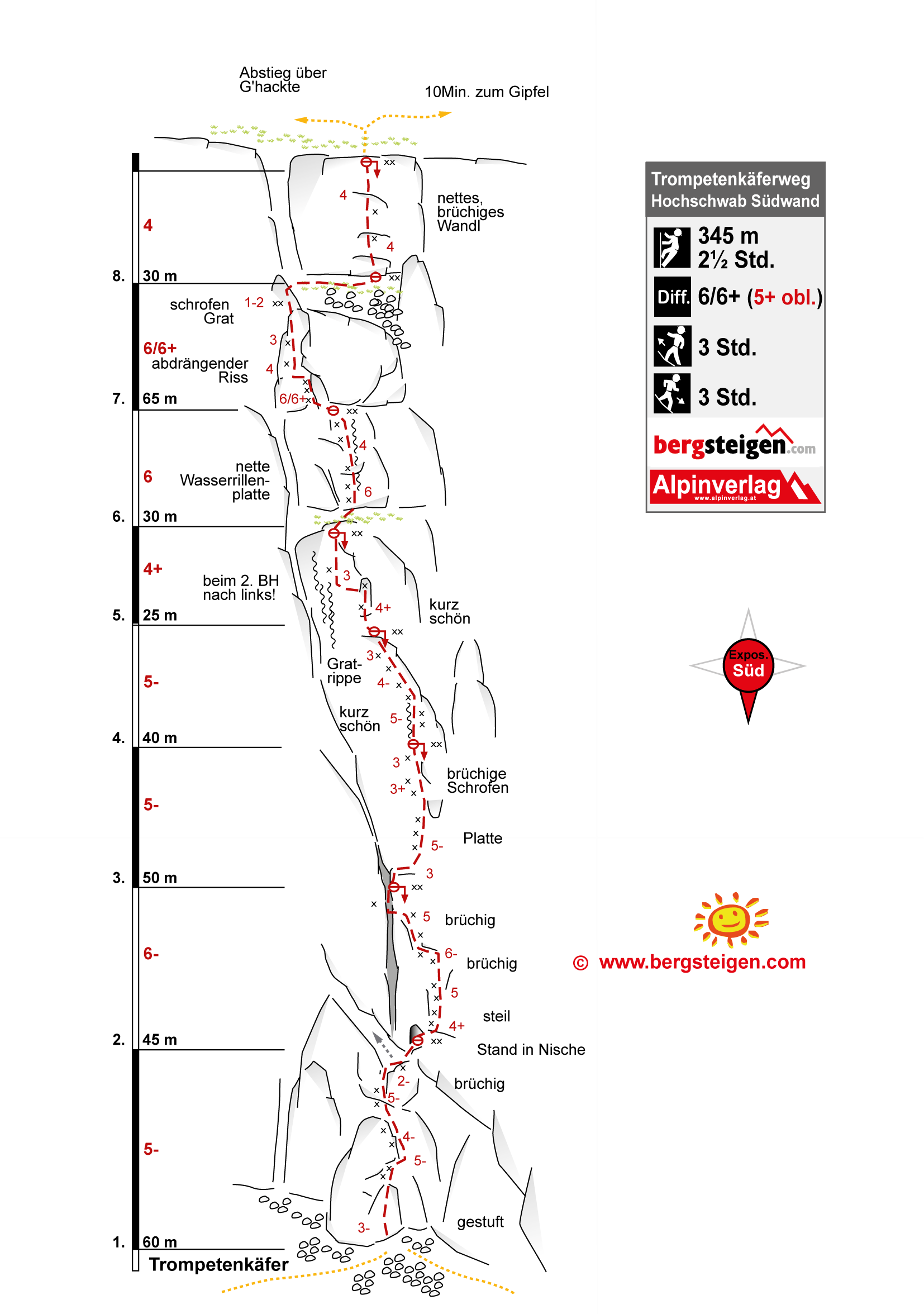 Neue Kletterroute im linken Teil der Hochschwab Südwand. Die Kletterei führt in den ersten drei Längen überwiegend an schrofig, steilen und in der zweiten Seillänge auch recht brüchigen Fels empo. Insgesamt vielleicht 70 wirklich schöne Klettermeter. Im Mittelteil werden die schönen Wasserrillen leider links liegen gelassen. Fazit: Wenn man sonst schon alles in der Südwand kennt, oder zufällig gerade vor Ort ist, muss man auch die Tour sicher machen.