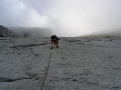 Stände fast immer gebohrt (ausser man steht auf einem wirklich großen Plateau), bei den schweren Stellen meist ein Zwischenhaken. In den leichten Plattenlängen steckt nichts und man kann in den glatten Platten auch keine Keile anbringen. Vor allem die Punktmarkierung ist bei der Wegfindung in den Riesenplatten sehr hilfreich.