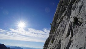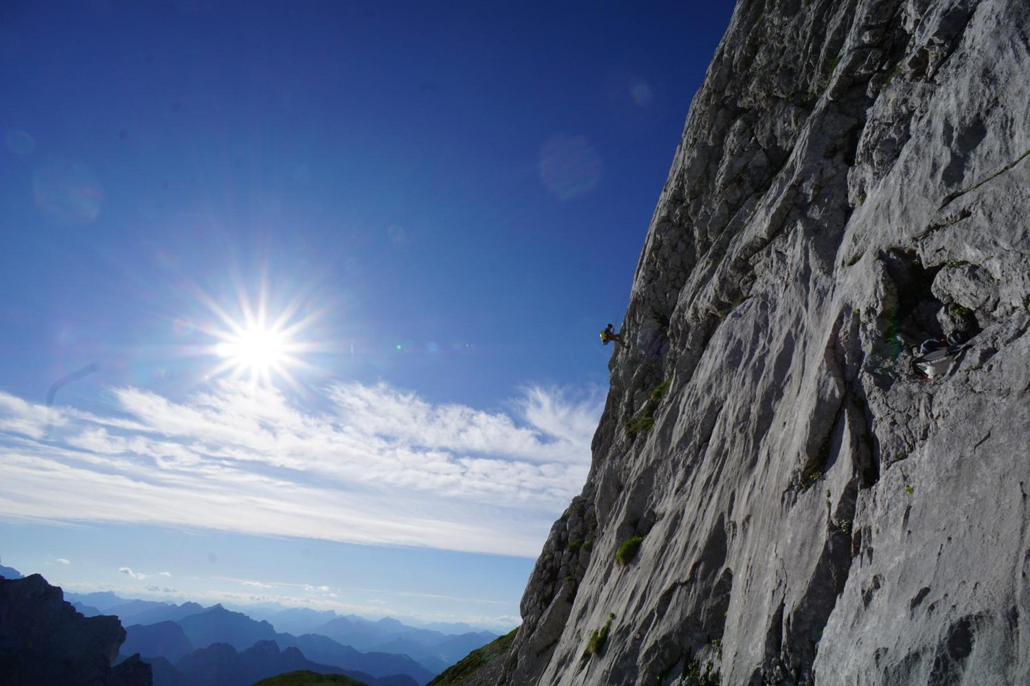 Abseilen über die Route (mit 55m-Doppelseil) und über Zustiegsweg retour.