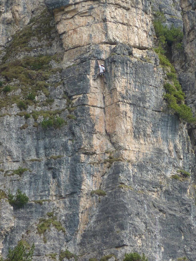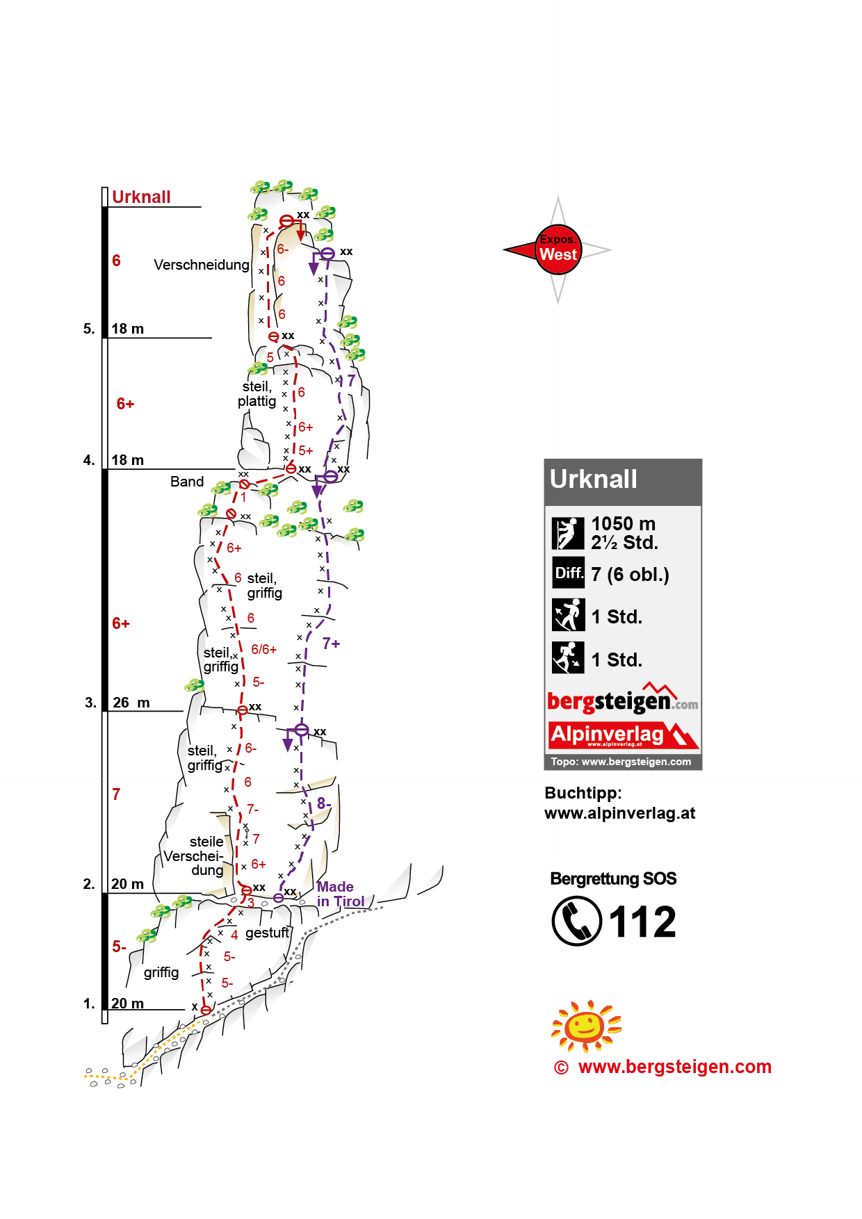 An der Schlüsselstelle in der zweiten Seillänge hängt sogar ein Schlüssel am Bohrhaken. Die Nebenroute „Made in Tirol“ ist ähnlich gut abgesichert, aber deutlich schwerer als der „Urknall“. Es gibt dort oben einen Klettergarten (lohnend) und andere Mehrseillängentouren, die nicht an die Qualität der Route „Urknall“ heran kommen.