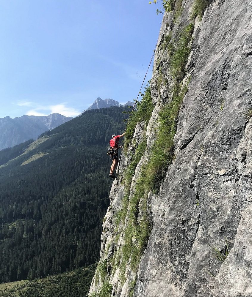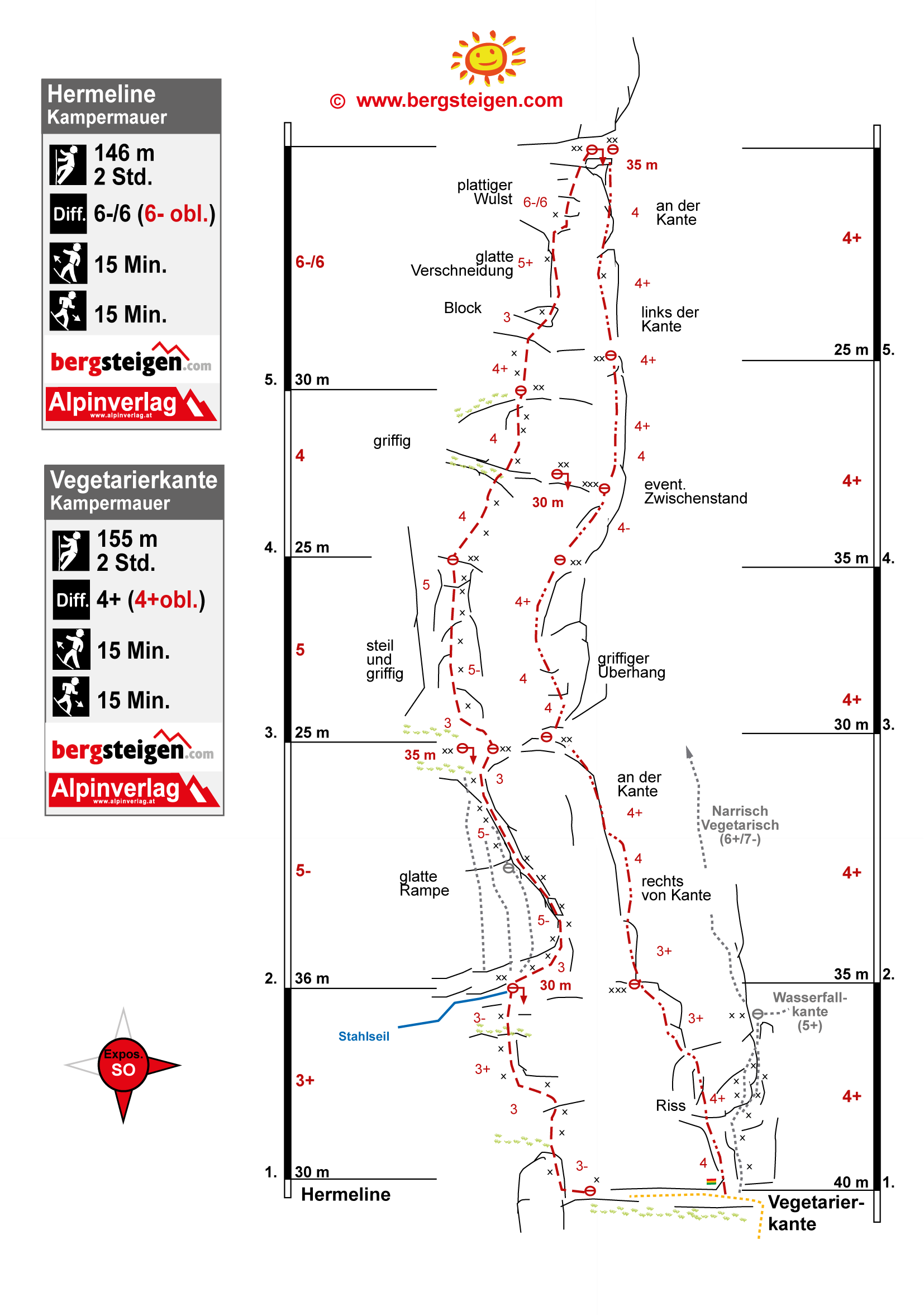 Diese Tour gehört in diesem Schwierigkeitsgrad zu den allerbesten Routen auf der Kampermauer bzw. in ganz Österreich. Die Route folgt immer rechts od. links der steilen markanten Kante am re. Ende der Kamperwand. Der Fels ist fest, henkelig und seine Griffigkeit erlaubt auch das Überwinden von zwei Überhängen (1. u. 3. SL). Die Crux wartet gleich nach den ersten 15 m. Die Schwierigkeiten bewegen sich sehr konstant im 4ten Grad.