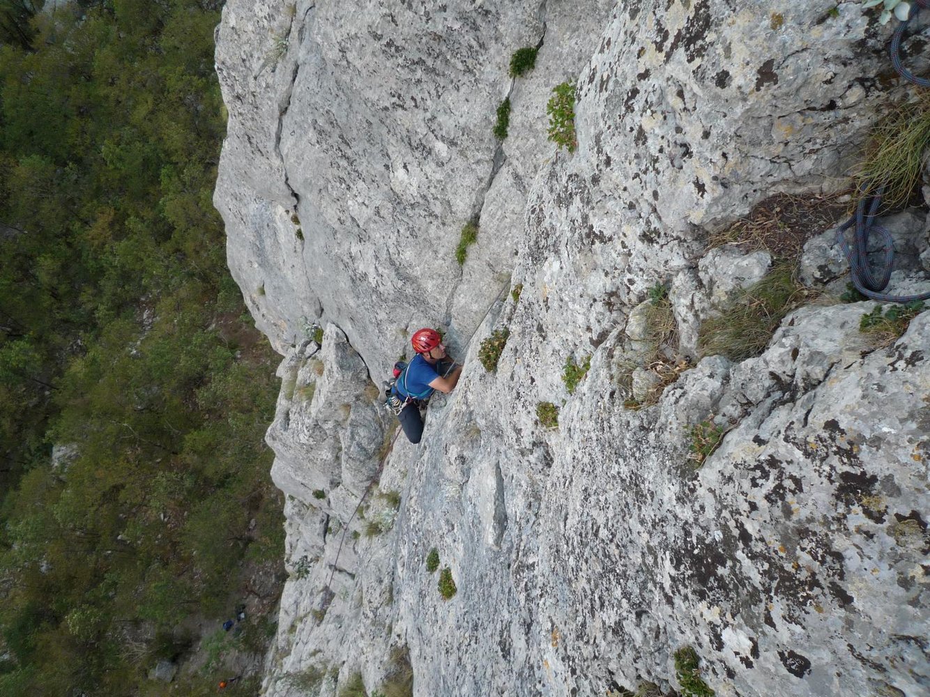 Die Route ist mit Bohrhaken gesichert und alle Stände sind gebohrt. Die Abstände sind aber auch hier, wie überall in Paklenica weiter. Ein mittleres Sortiment an Klemmkeilen und Friends ist jedoch nützlich. Die Abstände sind stellenweise etwas Weiter, siehe Topo!