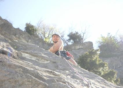 Herrliche Platten und Wandkletterei mit einer leicht überhängender Verschneidung am Ende. Die Tour ist gut mit Bohrhaken gesichert, Klemmkeile werden keine benötigt.