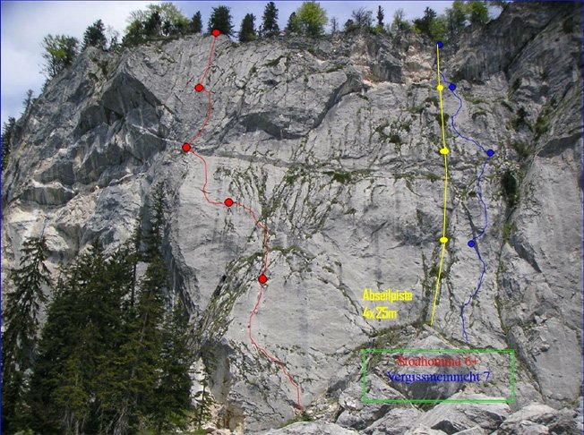 4 x 25 m über die Route Vergissmeinnicht abseilen.. Alternativ zu Fuß oben der Wand entlang nach Westen und vor einem Gipfelkreuz rechts zum Hütteneck-Rundwandweg absteigen und diesem nach Süden zur Forststraße folgen.
