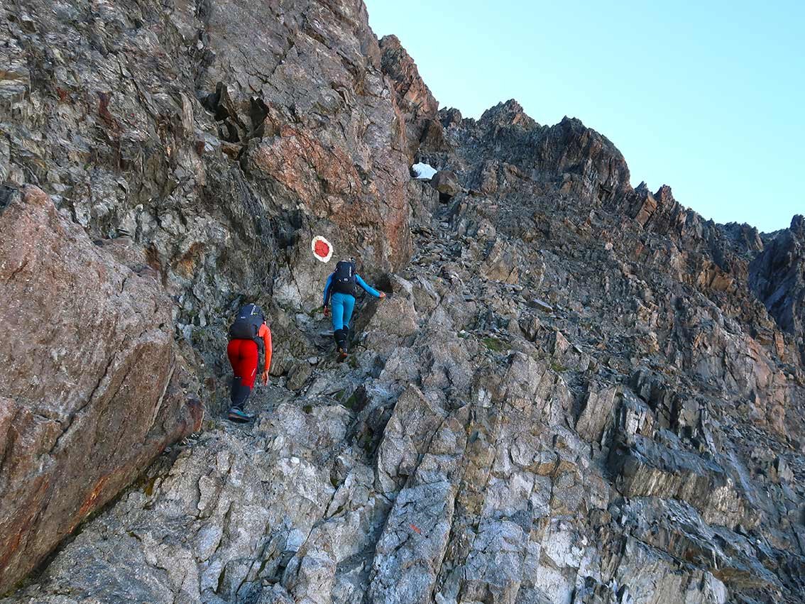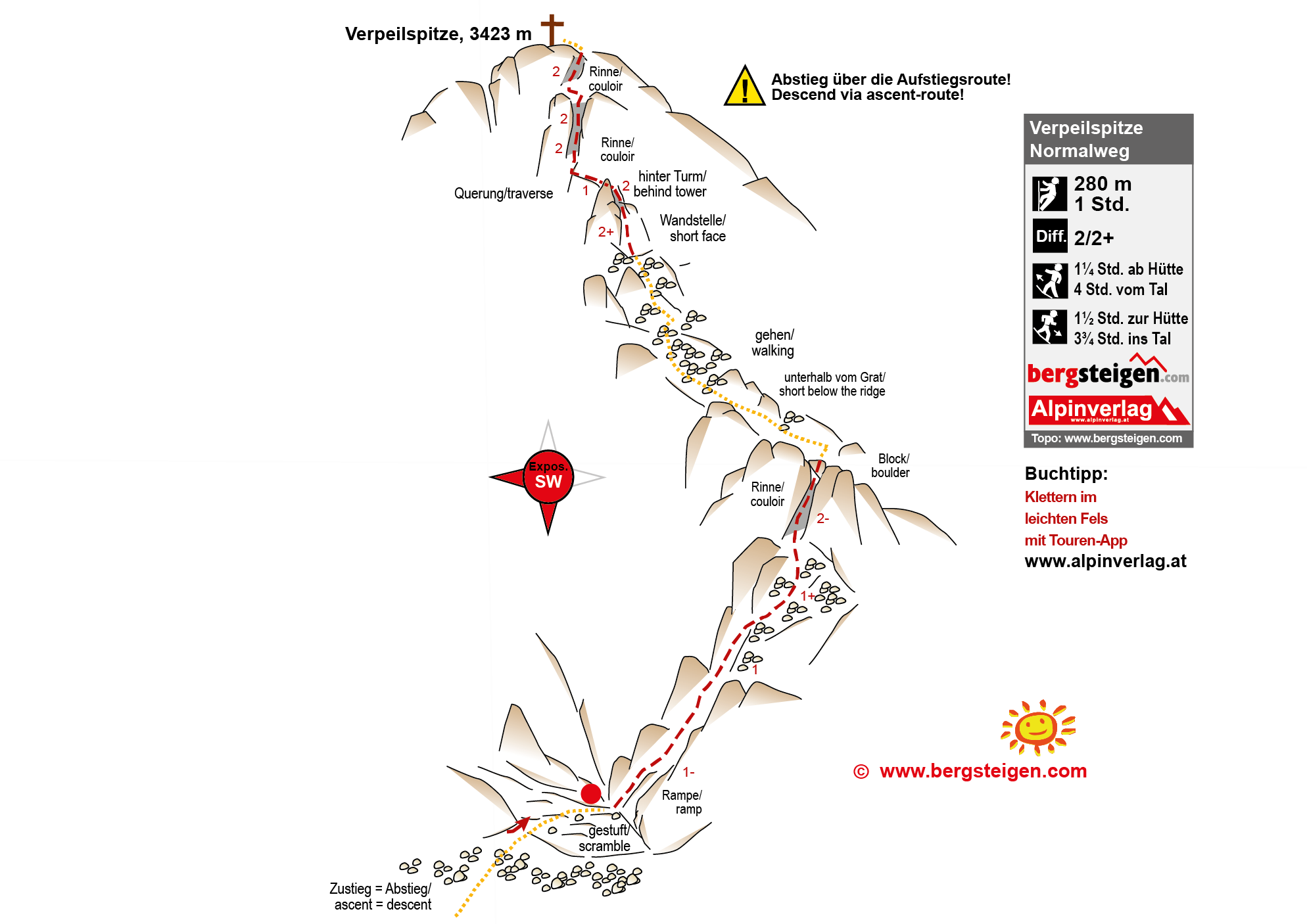 Die angegebenen Geh- und Kletterzeiten gelten für einen seilfreien Auf- und Abstieg. Mit Sichern oder Abseilen dauert die Tour entsprechend länger.