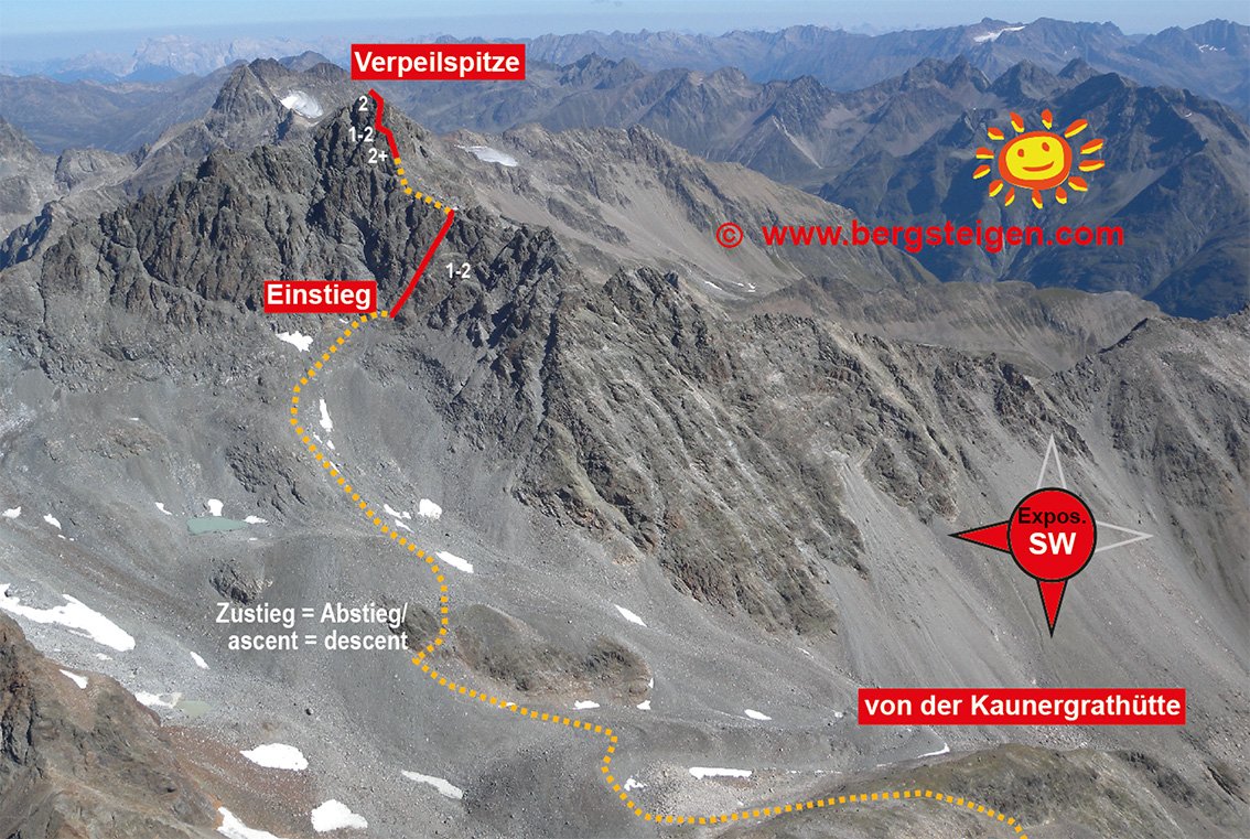 Von Plangeross am Weg 927 über die Plangerossalpe zur Kaunergrathütte aufsteigen. Von der Hütte den Wegweisern Richtung Verpeilspitze folgen. Ab der Abzweigung zum Plangerosskopf gibt es nur mehr Steinmännchen und sporadische Markierungen. Der Einstieg wird mit einem großen roten Punkt mit weißem Rand markiert.