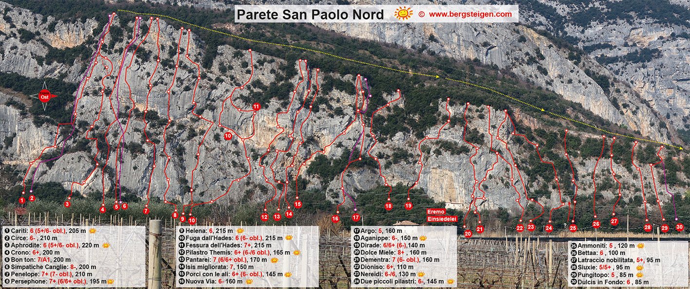 Wenn es wegen der großen Beliebtheit zu Staus kommt, kann man zur rechts der Einsiedelei liegenden "Via Nereidi" ausweichen. Vom Aufgang zur Einsiedelei auf der Asphaltstraße ca. 40 m nach Norden bis ein Steig zur Wand hinauf führt.