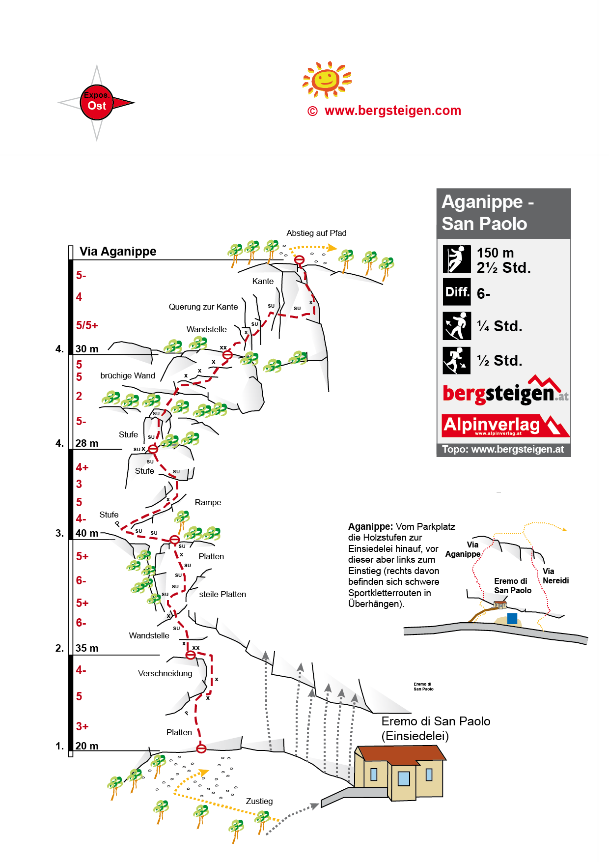 Sehr schöne, schon etwas abgekletterte Einsteigertour links der Einsiedelei Ermo di San Paolo. Die Tour ist primär mit Sanduhrschlingen gesichert, teilweise in recht engem Abstand. Die Erstbegeher haben eine schöne Linie durch die mit viel Büschen überzogene Wand gelegt.