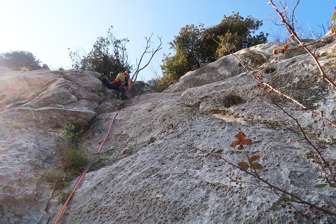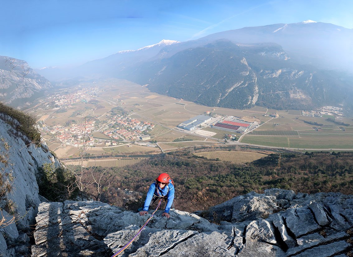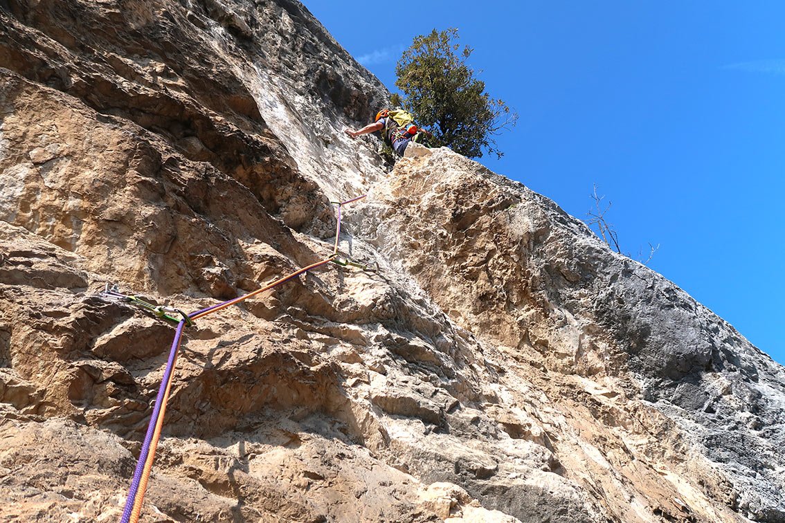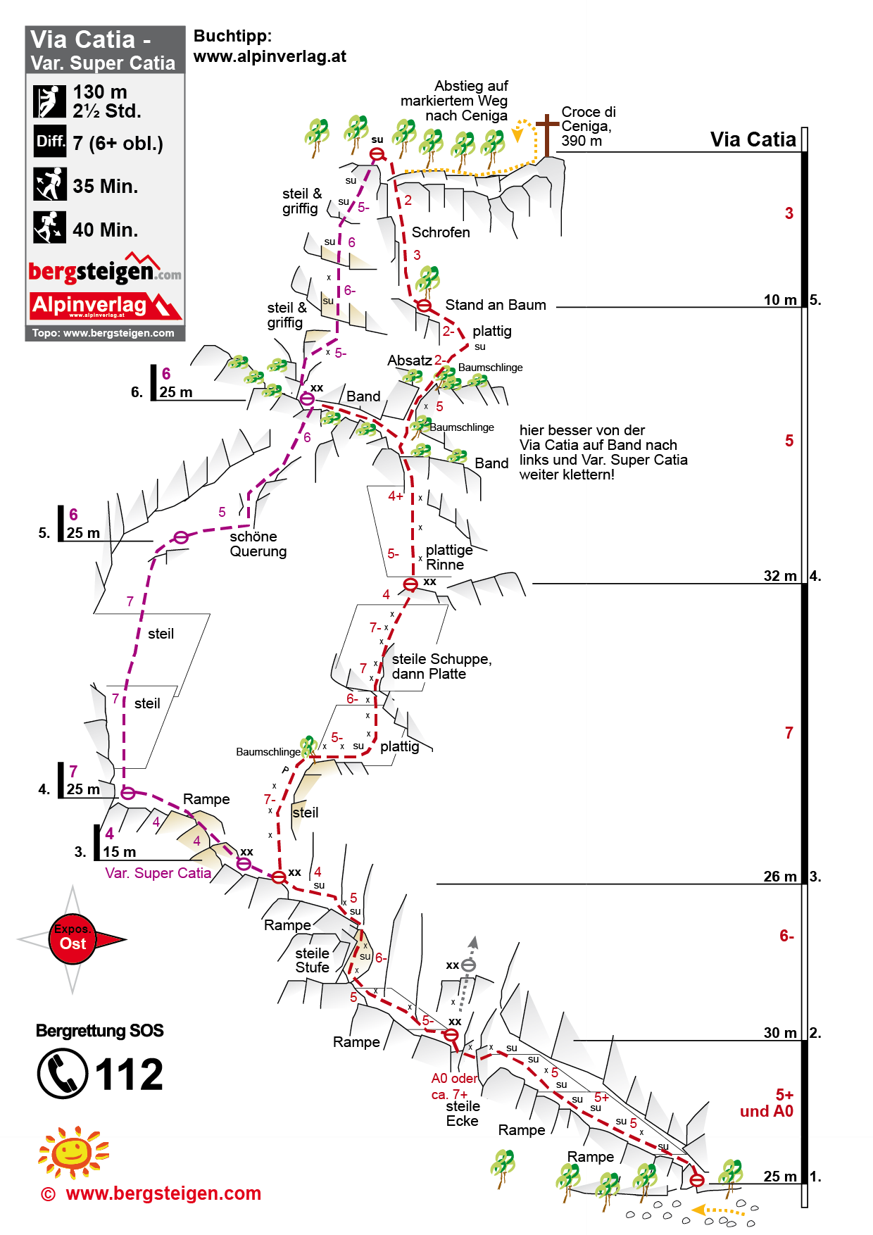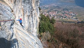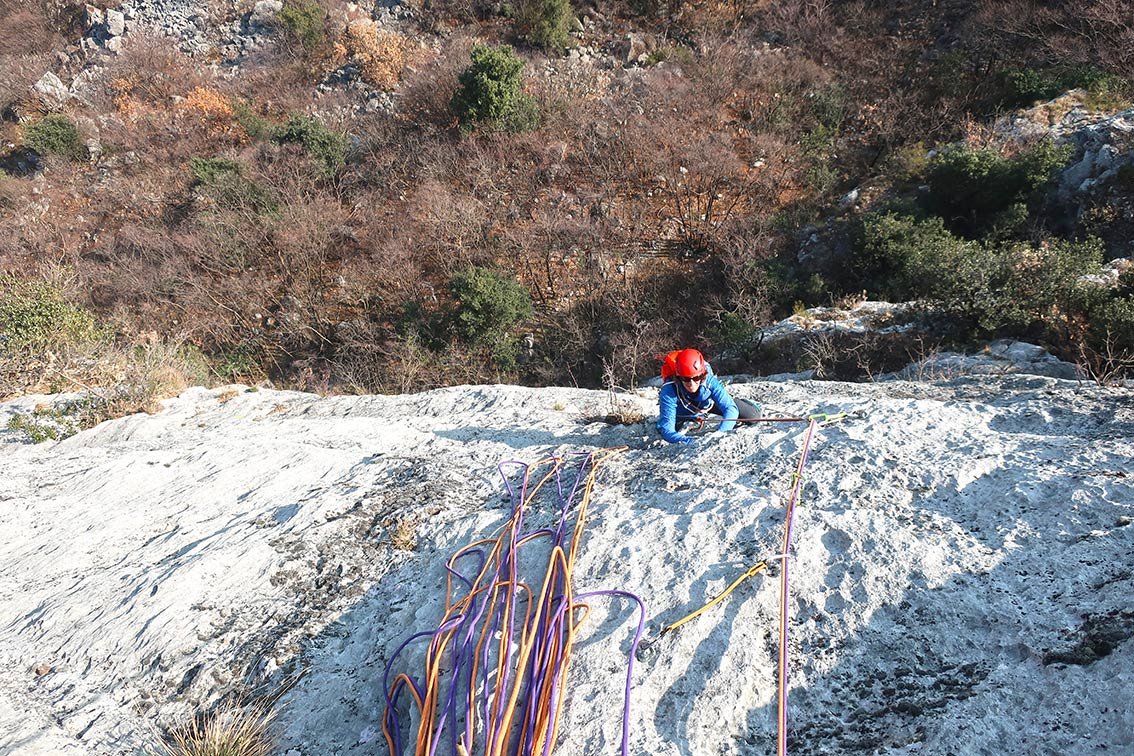 Sehr gut mit Bohrhaken abgesicherte Linie direkt in Gipfelfalllinie des Croce di Ceniga. Die Route hat tolle Querungen und als Finale eine diffizile Plattenpassage im Mittelteil (16 Expressschlingen nötig, wenn man alle Sicherungen einhängt!) - oben steigt man am besten über die letzte Seillänge der Var. Super Catia aus - so hat man wirklich das Beste aus dem Anstieg gemacht.