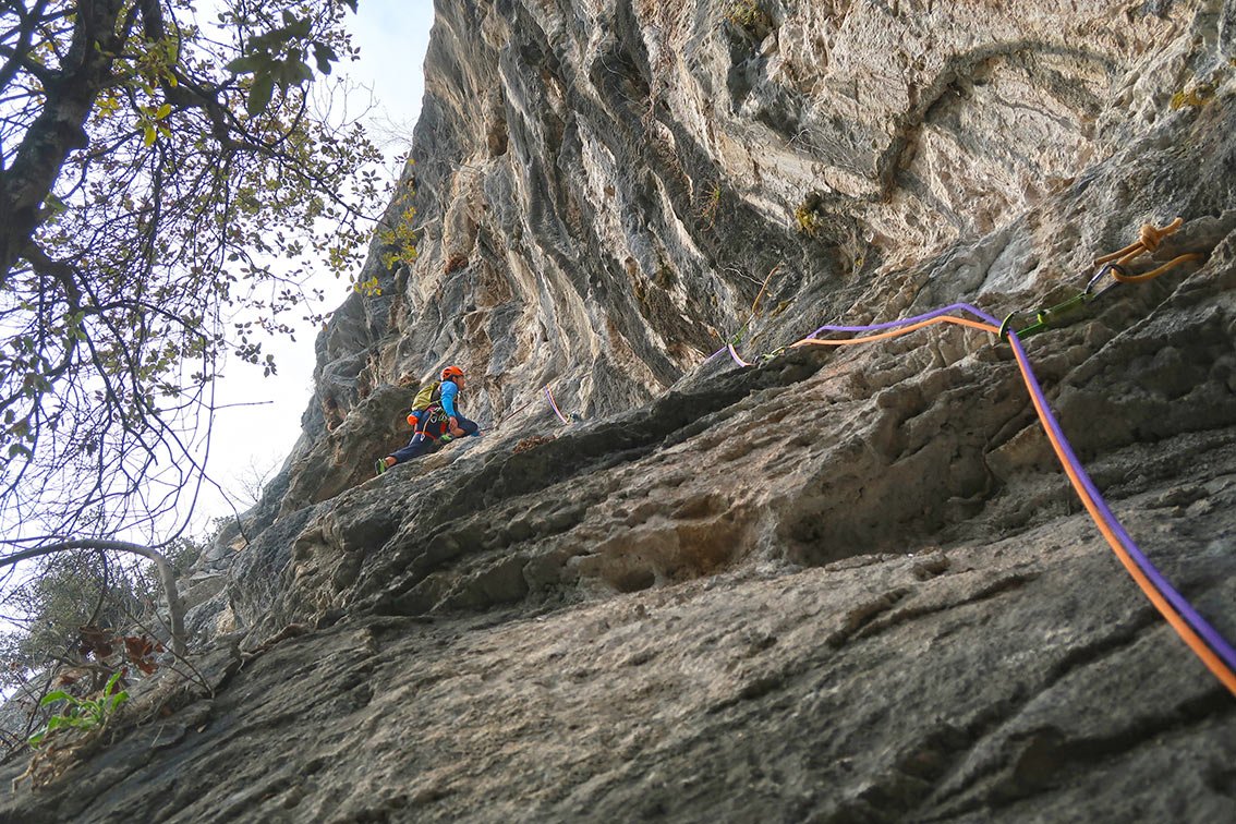 Vom Parkplatz zur römischen Brücke und von dieser links in Richtung Monte Colt. Gleich nach den Oliven-Terrassen aber nicht rechts weiter, sondern gerade auf dem Forstweg in den Wald. Nach wenigen Minuten zweigt rechts ein Pfad ab, dem man aufwärts bis zum Klettergarten folgt. Vom Klettergarten der Wand entlang bis zum Einstieg (ist angeschrieben).