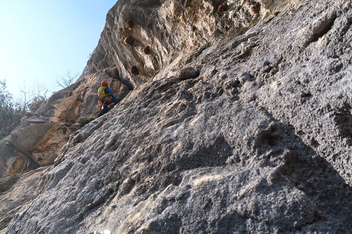 Sehr gut mit Bohrhaken abgesichert - an der Schlüsselstelle mehr als üppig.