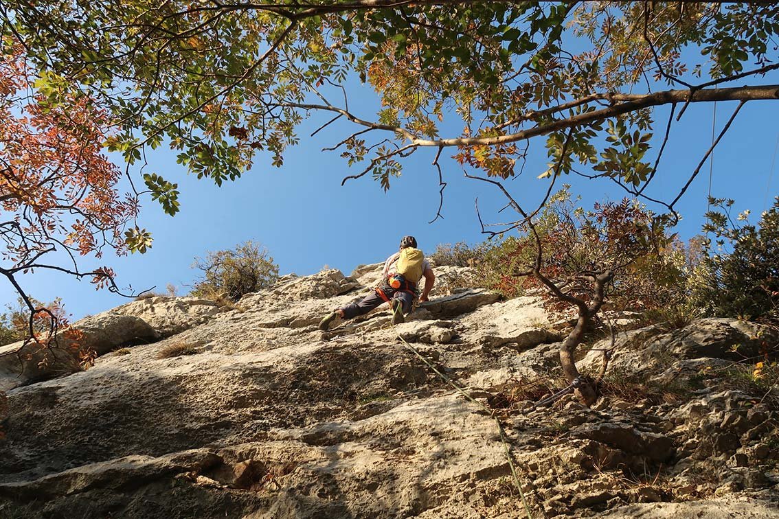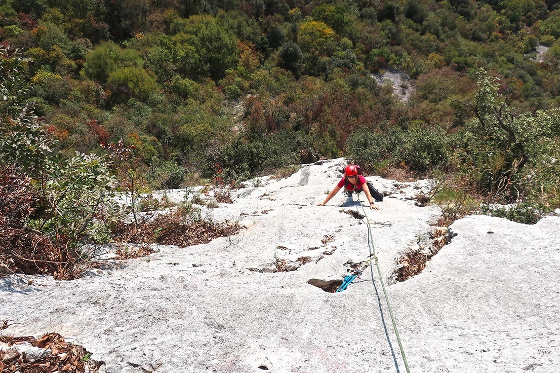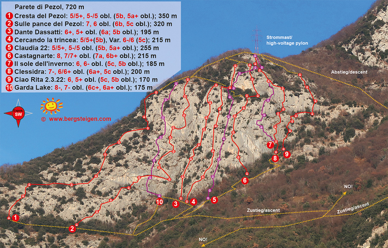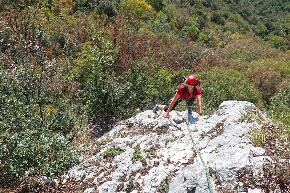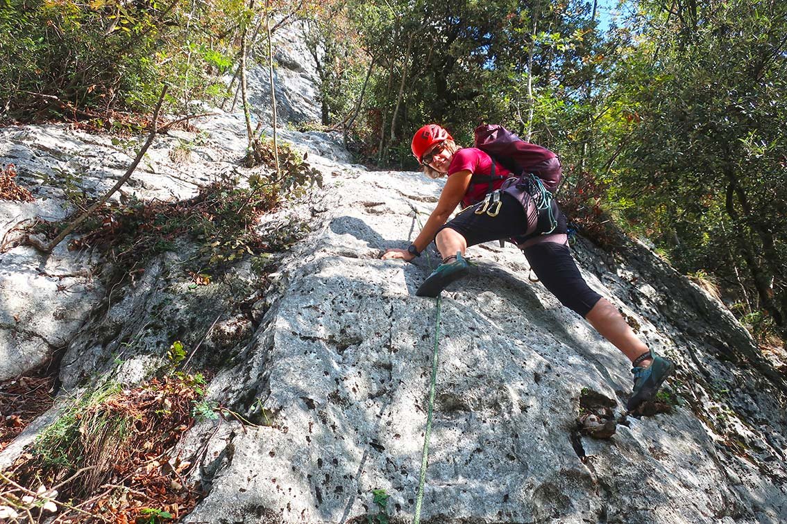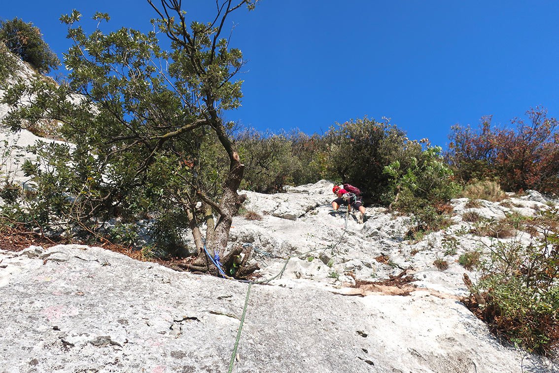 Die Claudia 22 ist eine der längsten, leichteren Touren an der Parete Pezol. Der Anstieg verläuft meist über Platten, aber auch kurze Verschneidungen und Wandstufen sind zu bewältigen. Die letzten drei Seillängen (welche man auch problemlos links zu Fuß umgehen kann) beginnen etwas rustikal, dafür steigt man aber auch direkt beim großen Strommasten auf dem Pezol "Gipfel" aus und kann von dort den perfekten Ausblick auf den Gardasee genießen!
