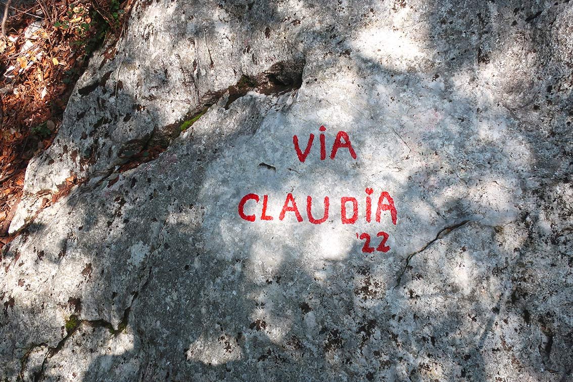 Vom Schranken dem Forstweg geradeaus folgen, nach 200 m aber links auf einem Pfad (rote Punkte) hinunter. Man gelangt zu den Felsen der Parete dell Ir und geht zwischen oberer und unterer Wand hindurch aufwärts. 40 m nach den gelb-schwarzen Überhängen, die man rechts oben sieht, kommt man zu einer spitzwinkeligen Verzweigung. Der obere steilere Weg ist der Rückweg. Dort den flacheren unteren Weg nehmen (von unten mündet bald der Rückweg von der unteren Parete dell’ Ir ein) und länger bis zu einer kleinen Lichtung gehen (links ist ein kleiner, bewachsener Hügel). Dort nach rechts abzweigen (!) und nach 30 m sofort wieder links. Den Steigspuren (tlw. blaue Punkte) bis unter die Parete Pezol folgen und in einem kleinen Schuttfeld zur Wand hinauf. Man steht genau vor der "Claudia 22" Route.