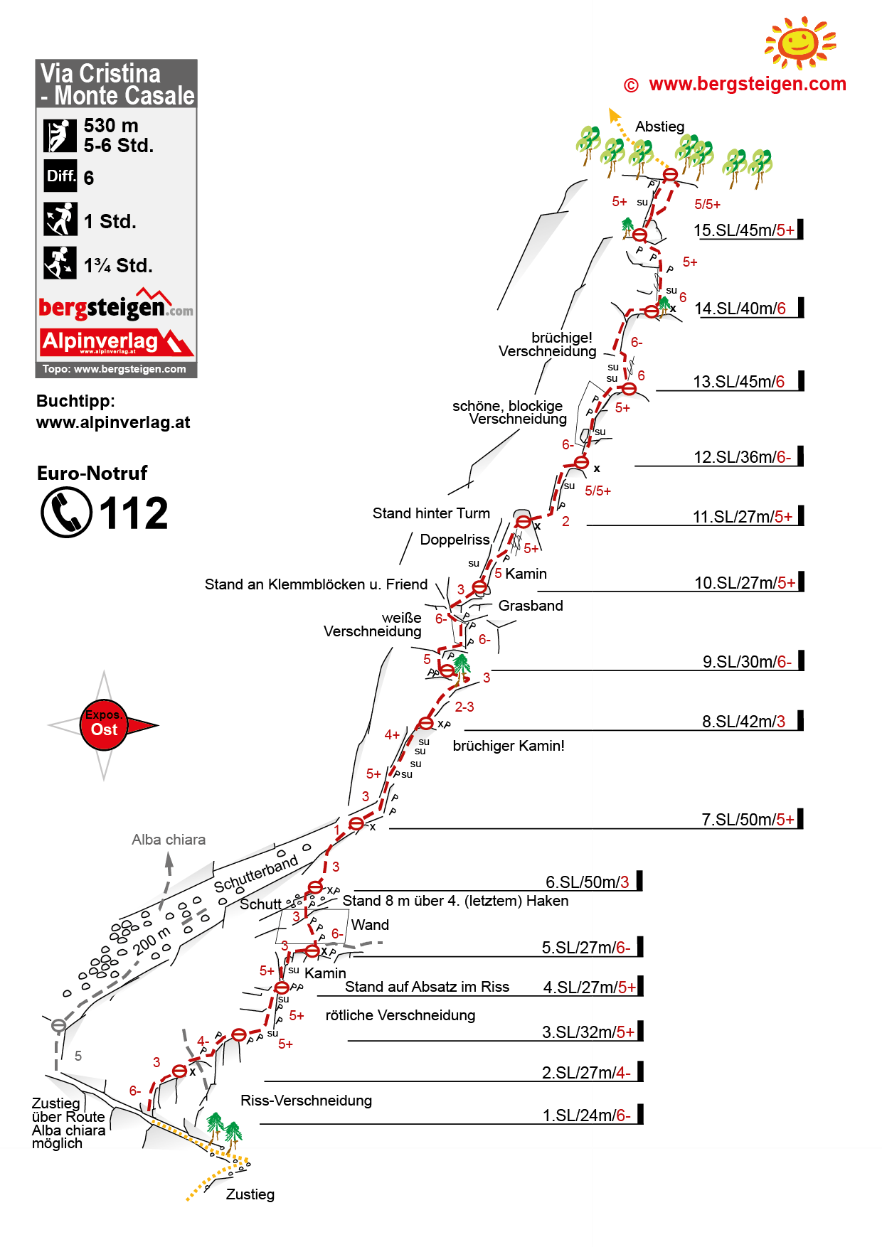 Die Route Via Cristian ist eine der leichteren Anstiege am Monte Casale. Der Anstieg hat einzelne schöne Seillängen, der Großteil ist aber brüchig und nicht unbedingt ein Klettergenuss. Die Kletterei ist sehr abwechslungsreich; die Tour hat alles von brüchigem Kamin, tolle und weniger tolle Risse, etwas brüchige Wandkletterei und grasige Querungen. Für rustikale Alpin-Freaks ein evtl. brauchbares Abenteuer, wer schönen Fels und lohnende Kletterei sucht, findet die dort aber nicht.