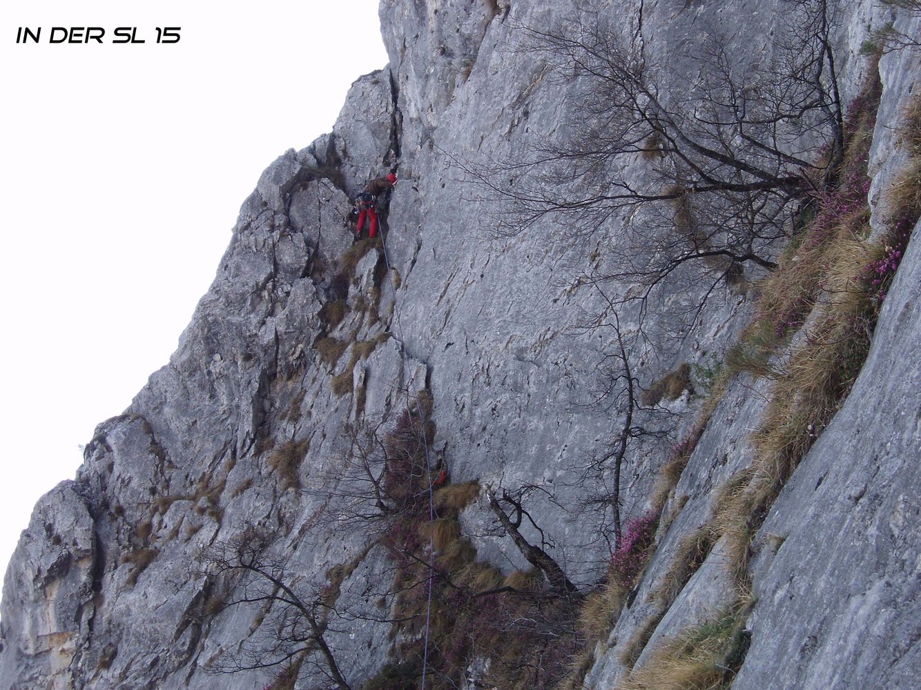 In der Tat, die sind gerade mal 400 Meter hoch und der Einstieg in die eigentliche Ostwand des Monte Brento liegt noch über den Ausstiegen der Sonnenplatten, um nochmals 1000 Meter höher mit einem kessen Hörnchen zu enden, von dem sich die Basejumper ins Leere stürzen. Es soll einer der besten Sprünge Europas sein, und relativ sicher obendrein, immerhin hängt die Wand auf den letzten 600 Metern konsequent über, und zwar 120 Meter weit. Der Springer hat also 1000 Meter Flug Zeit den Schirm aufzubekommen bevor der erste Bodenkontakt droht.