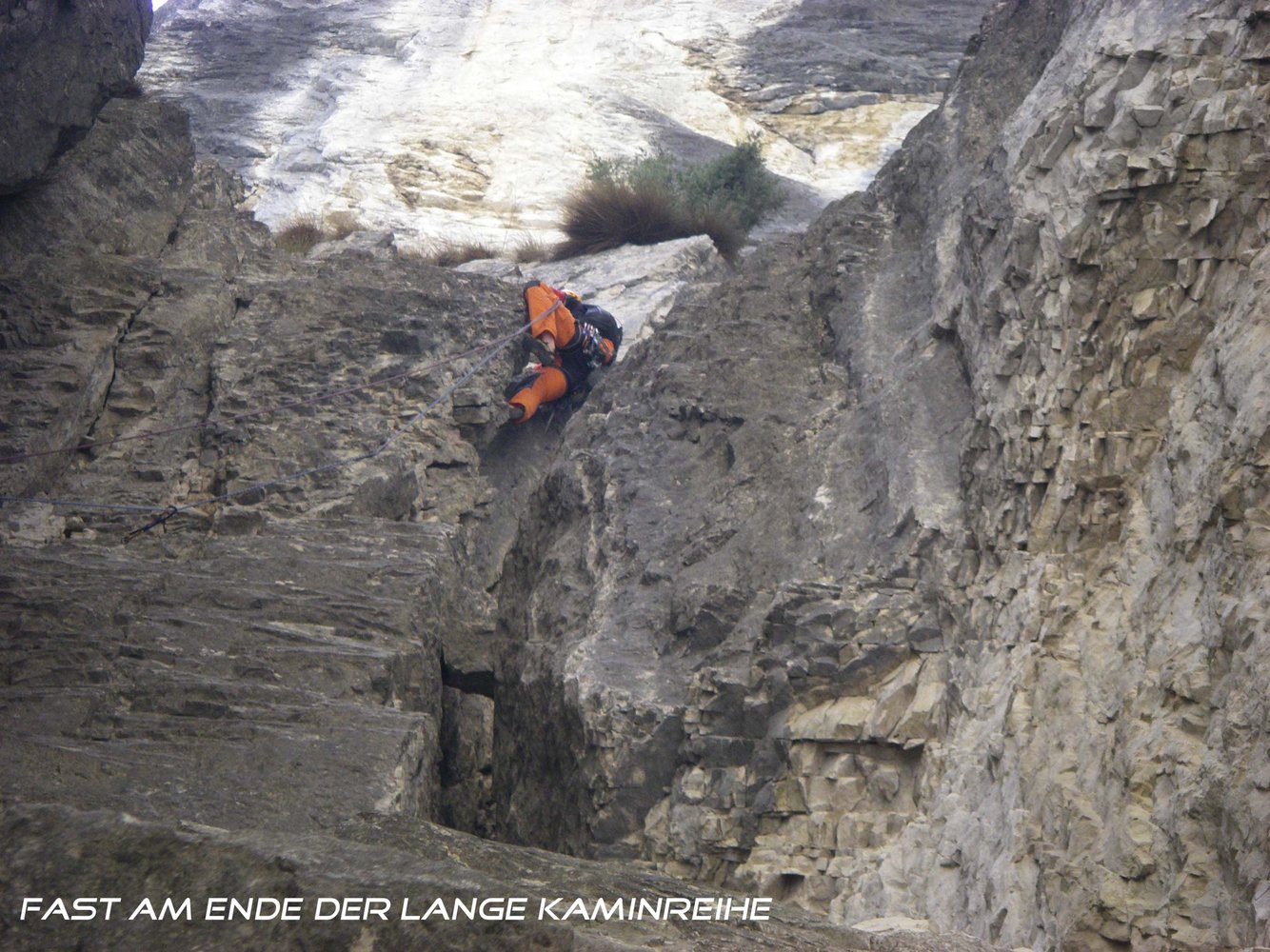 Ist ist nicht ratsam einzusteigen wenn sich bereits Kletterer in der Wand befinden. Die Einstiegsverschneidung ist unangenehm, sehr steinschlaggefährdet und sollte schnell hinter sich gebracht werden.
