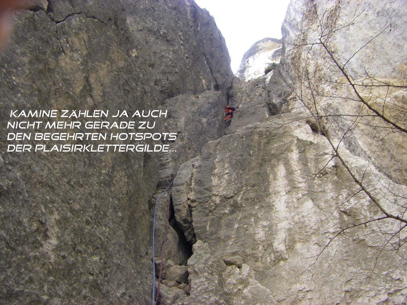 Die Route besticht nicht gerade durch festen Fels oder besonders schöne Kletterstellen wie wir sie heute gewohnt sind, der optimale fels ist hier schon da wenn er nur fest ist. Kamine zählen ja auch nicht mehr gearde zu den begehrten Hotspots des Plaisirklettergilde. Wer hier seinen Spaß haben will sollte eine ordentliche Portion schwarzen Humors mitbringen, wird aber mit unvergesslichen Eindrücken belohnt. Der Weg der Freunde erweist sich als ein Weg der Freude für diejenigen die alle Spielarten des Alpinkletterns noch nicht vergessen haben, die Spaß an unkonventioneller Sicherungsmethodik haben, den richtigen Weg finden und nicht nur suchen, und die Freunde haben die sowas mitmachen.